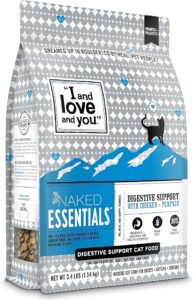 The “I and love and you” Naked Essentials Dry Cat Food is a grain-free kibble that provides digestive support for cats. It is made with USA farm-raised chicken as the primary ingredient and is packed with protein to boost energy and maintain lean muscle mass. The food contains fiber and pre & probiotics for easy digestion, and is free from GMOs and grains.