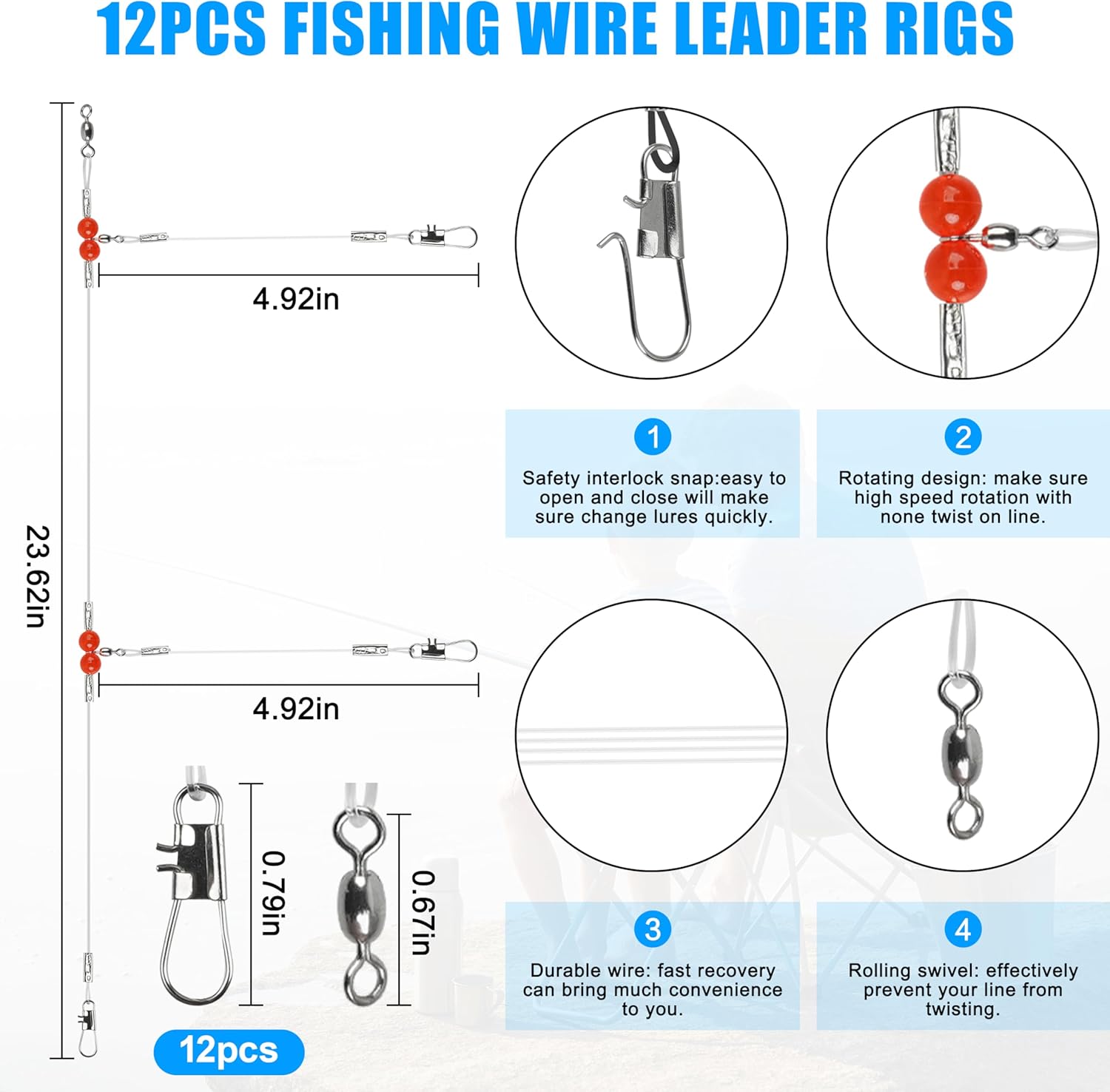 SURF FISHING TACKLE: Includes 12pcs fishing leaders, 4pcs pyramid sinker weight, 1pc bass casting sinker