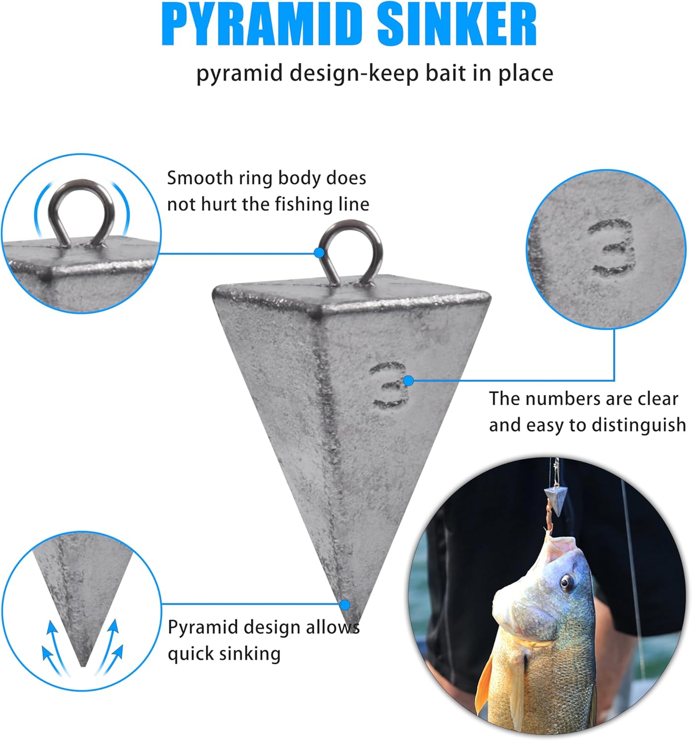 PYRAMID SINKER: It is pointed on the end and the corners of the sinker will dig into the bottom to anchor your bait in place against the waves and currents. The flat edges make it sink quickly