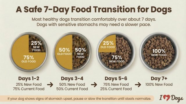 When switching dog foods, a gradual transition over 5–7 days helps minimize digestive upset. Start by mixing 75% old food with 25% new food, then slowly increase the proportion of new food every couple of days until the switch is complete. Throughout the transition, monitor for loose stool, vomiting, gas, or appetite changes, and slow the process if any issues arise.