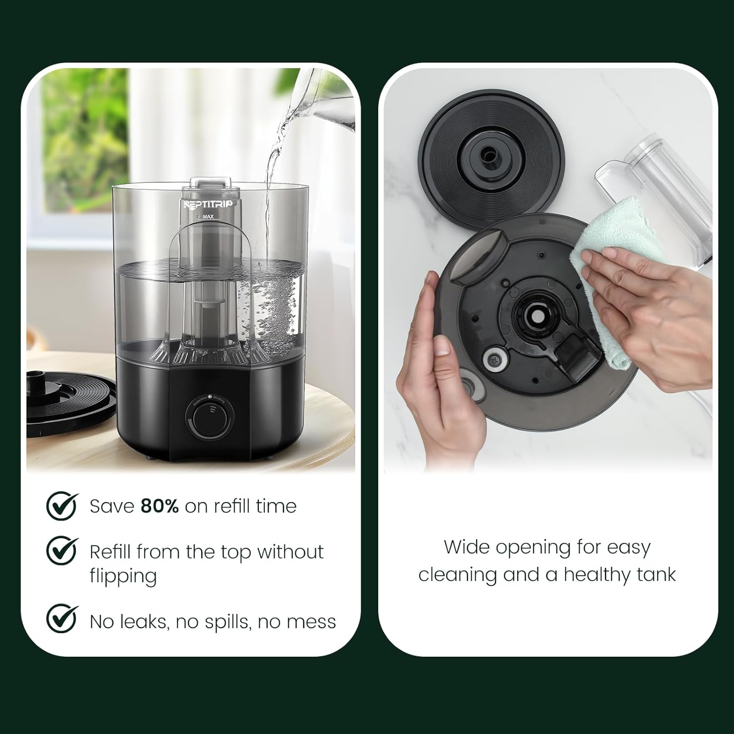 Leak-Proof Tank: Unlike detachable tanks that easy leak, our reptile humidifier’s water tank is built as one solid piece with its base. That means no leaks at all! Comes with rubberized anti-slip base and tip-over protection.