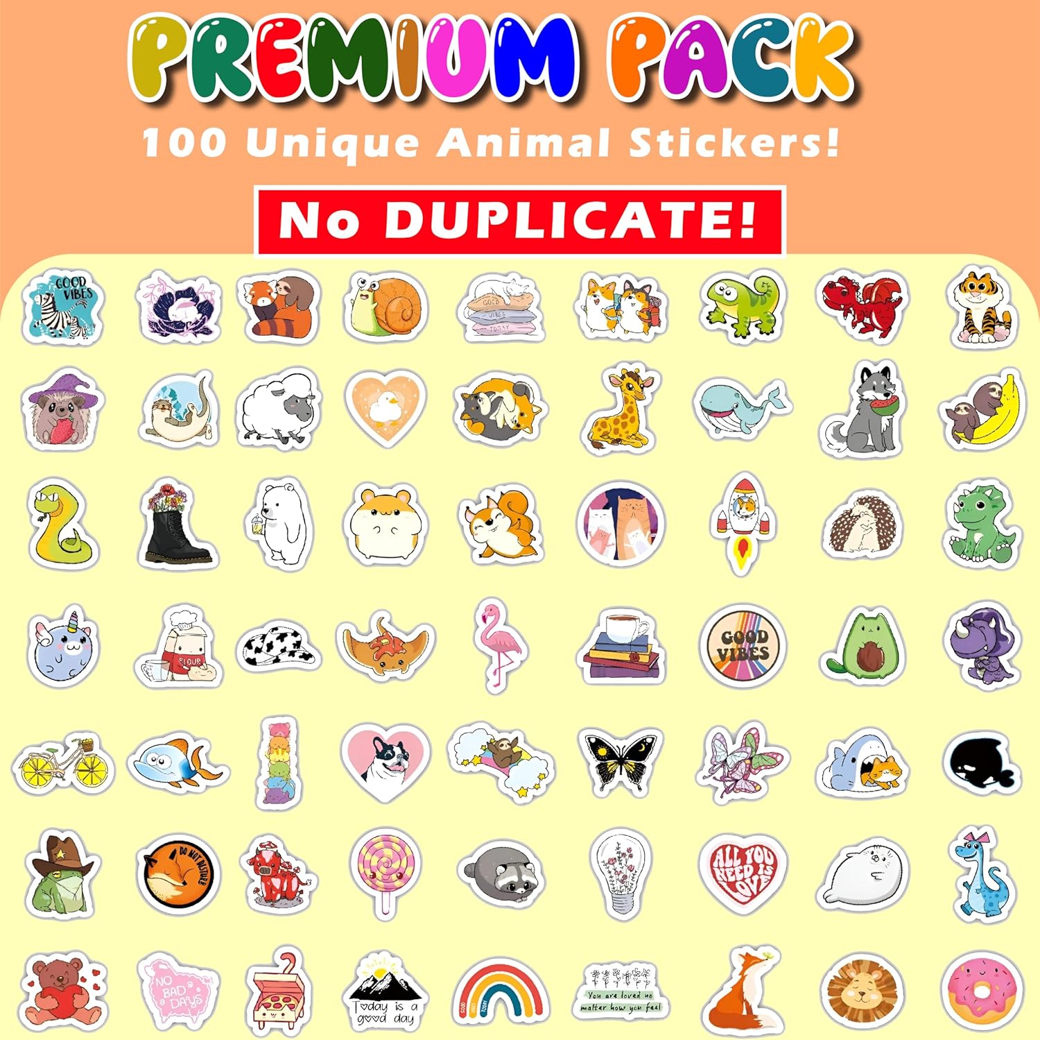 100 Unique animal stickers: You get a generous variety of 100 unique vinyl stickers, with a lot of lovely animal patterns, No Duplicates, and the same design as shown in our images. Each sticker pack is printed with cool and vibrant colors, making it easy to mix, match, and stick anywhere your imagination takes you. Each sticker has a size of 5-8 cm.