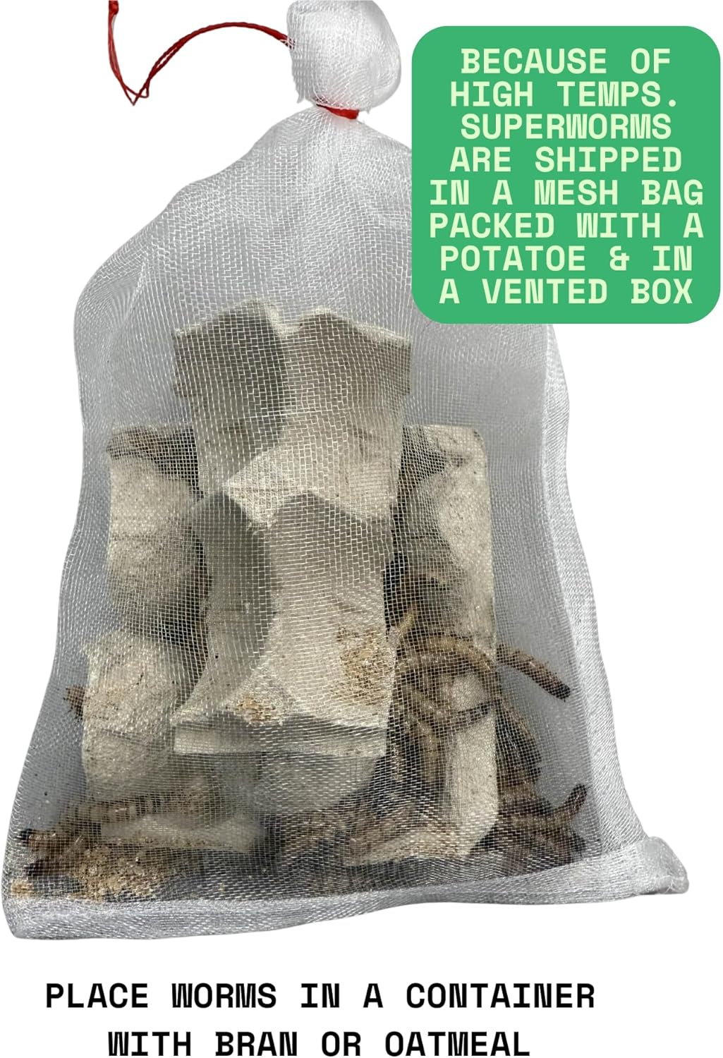 Shipped in a mesh bag with potato. Put superworms in a container with oats or bran once received and give new hydration source