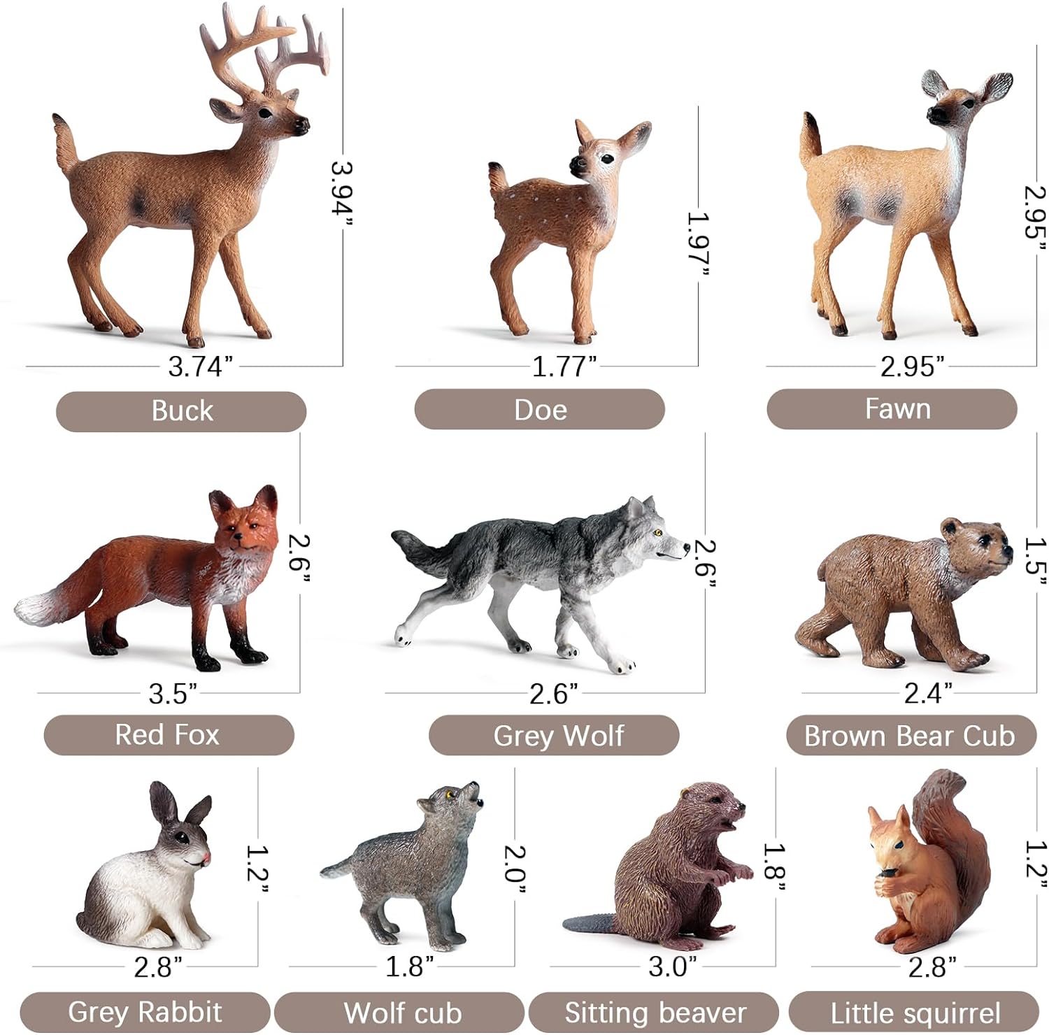 10PCS Forest Animals Figures: Playset includes European elk, doe, fawn, wapiti, wolf, okapi, brown bear, red panda, beaver, badger. Natural appearance and color, Good quality and durable to deal with lots of play.