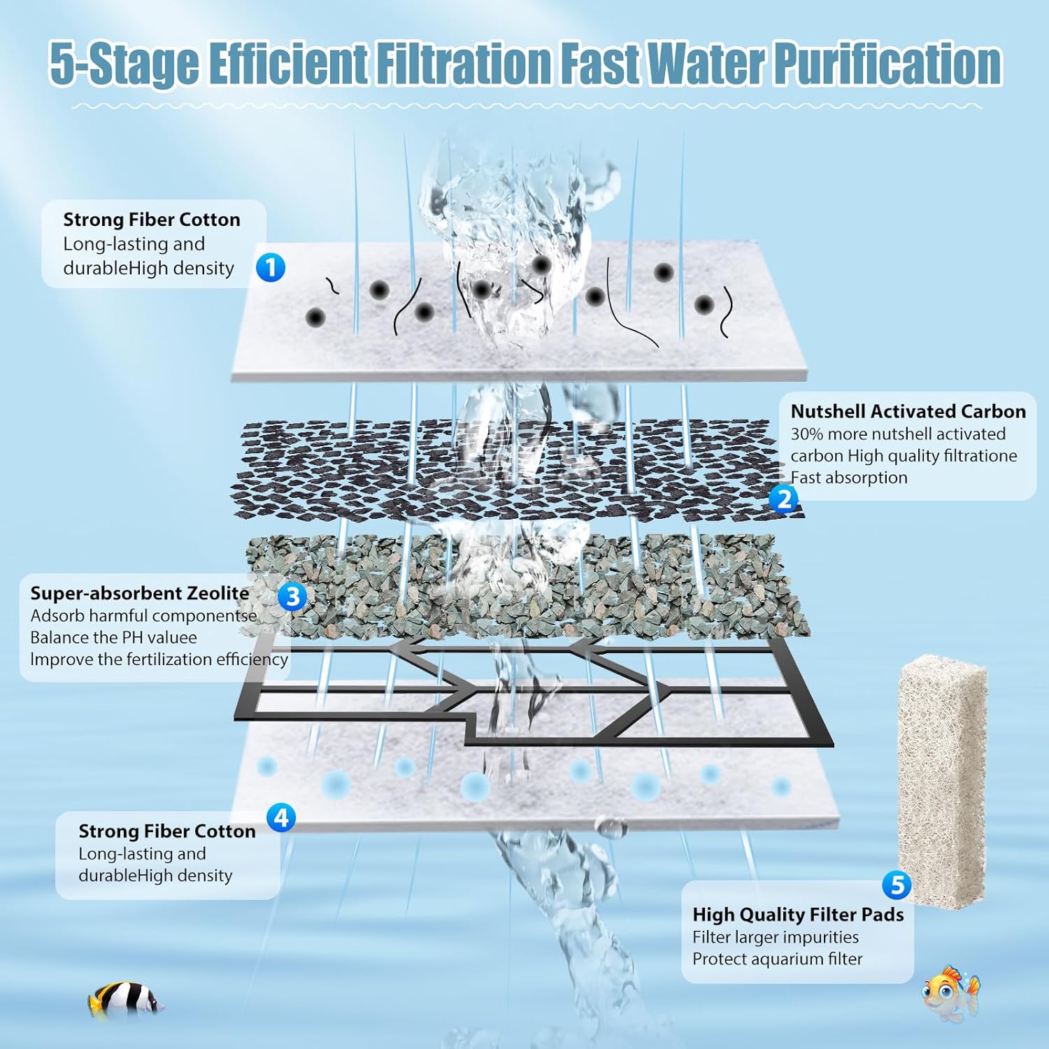 Excellent 5-Stage Filtration Performance: Ammonia reducer filter pads + carbon filter Cartridges perfect combination forms a complete filtration system, which can filter and absorb 99% of the impurities, so as to keep the water source clean and the healthy growth environment of fish.
