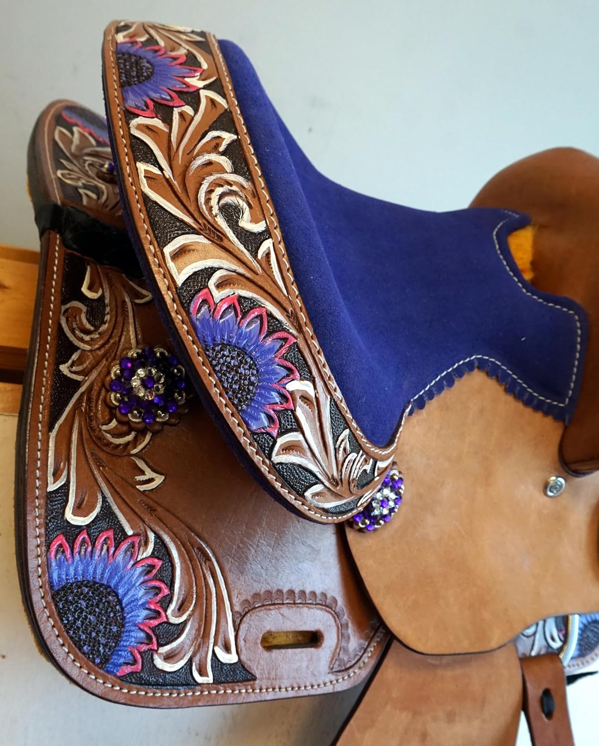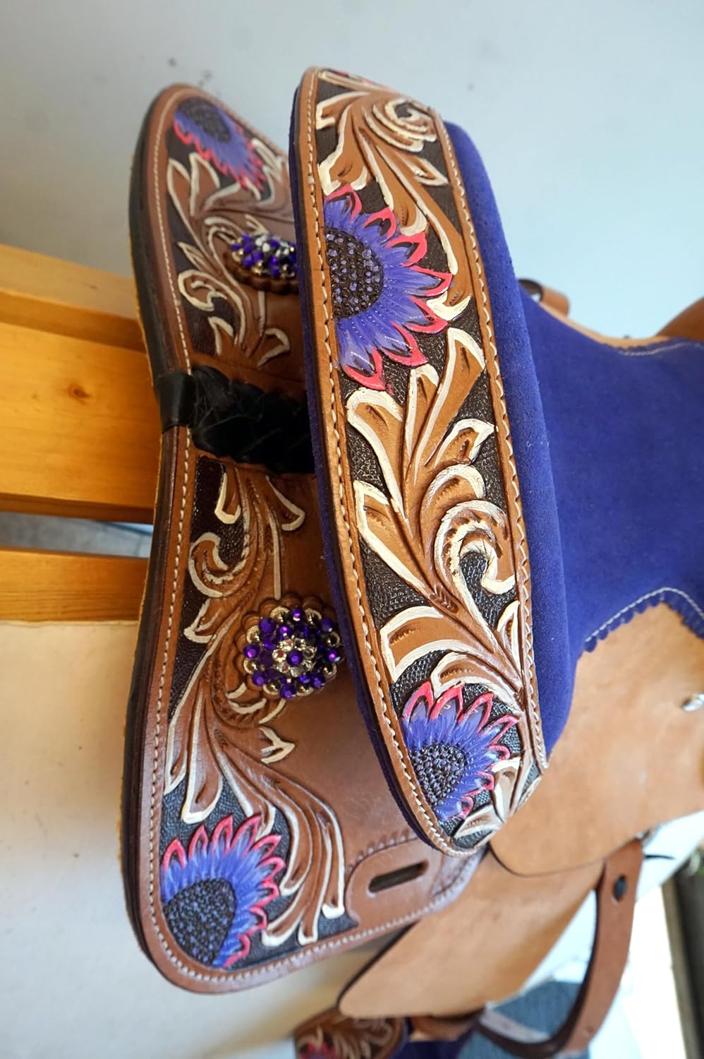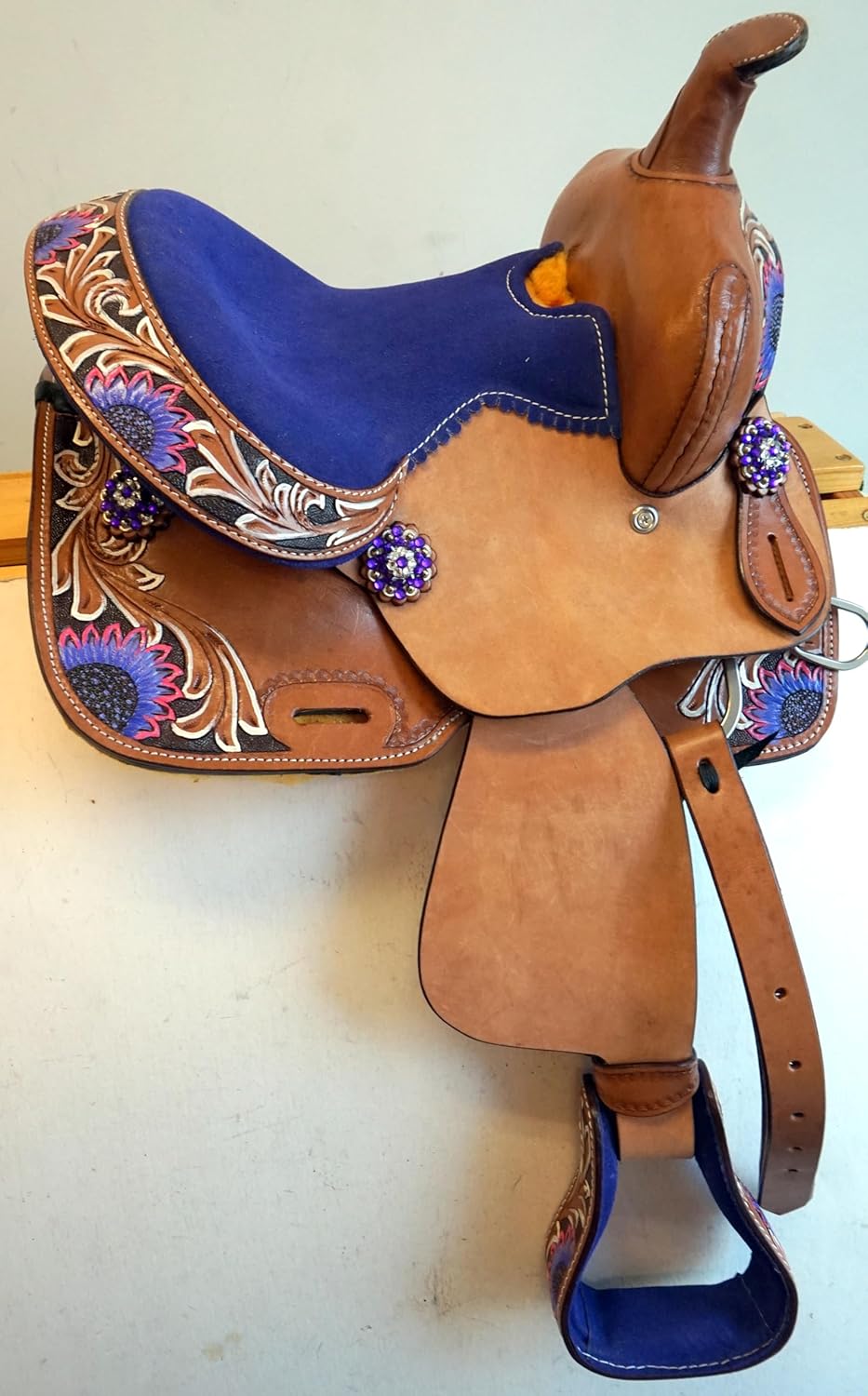 12″ YOUTH Tooled Leather with hand painted flower Western Pony/Horse Saddle. FEATURES: 12″ Suede Seat, Skirt: 18″L x 19″ W, Pommel: 10 W, Cantle: 4″, Horn: 2″, Gullet: 5″, Stirrups: 26″- 29″ Length, Made on a Sturdy Fiberglass tree. SEMI Quarter Horse Bars.