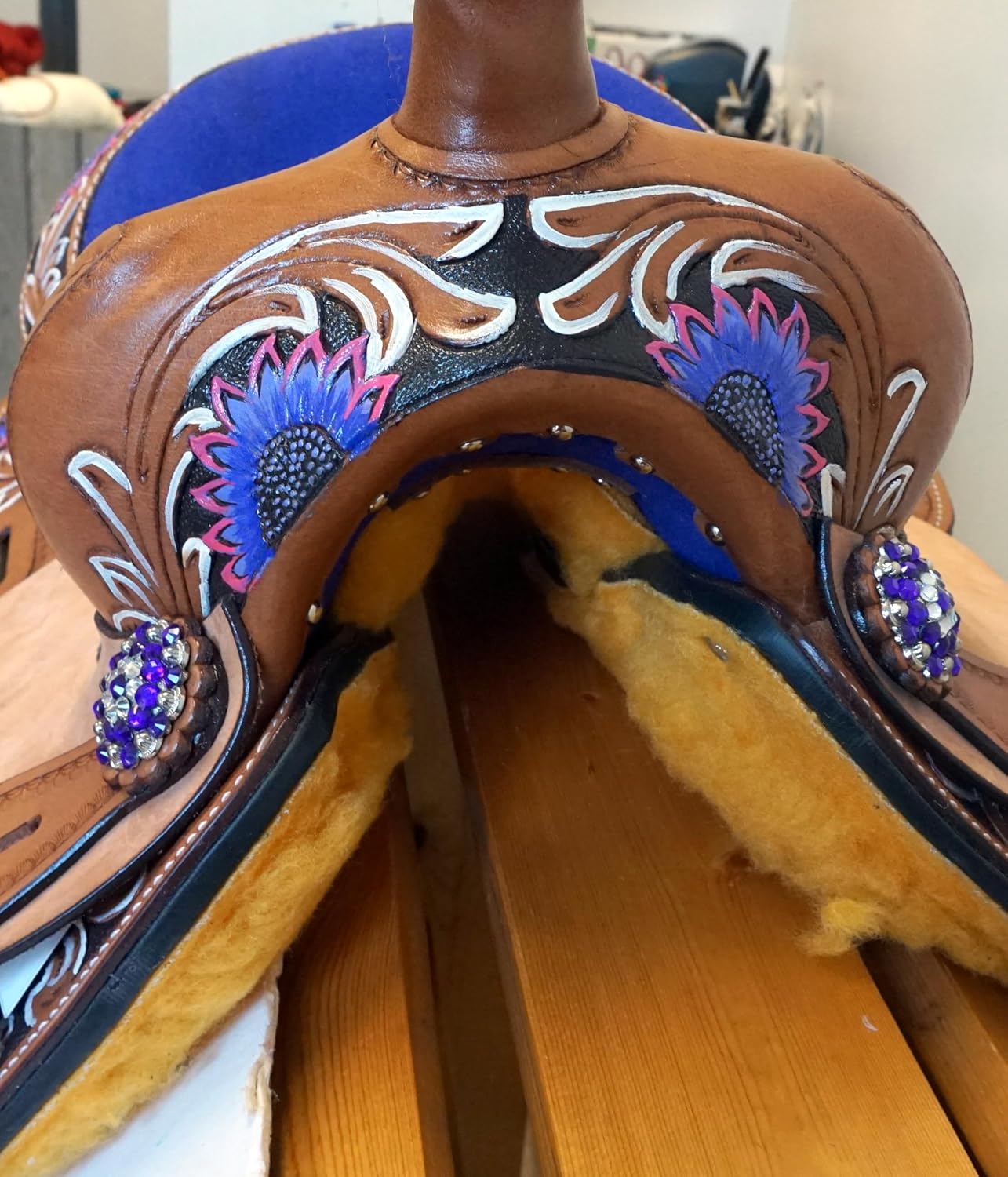 12″ Western Pony Youth Leather Saddle with Hand Painted Flower and Matching Color Suede Seat