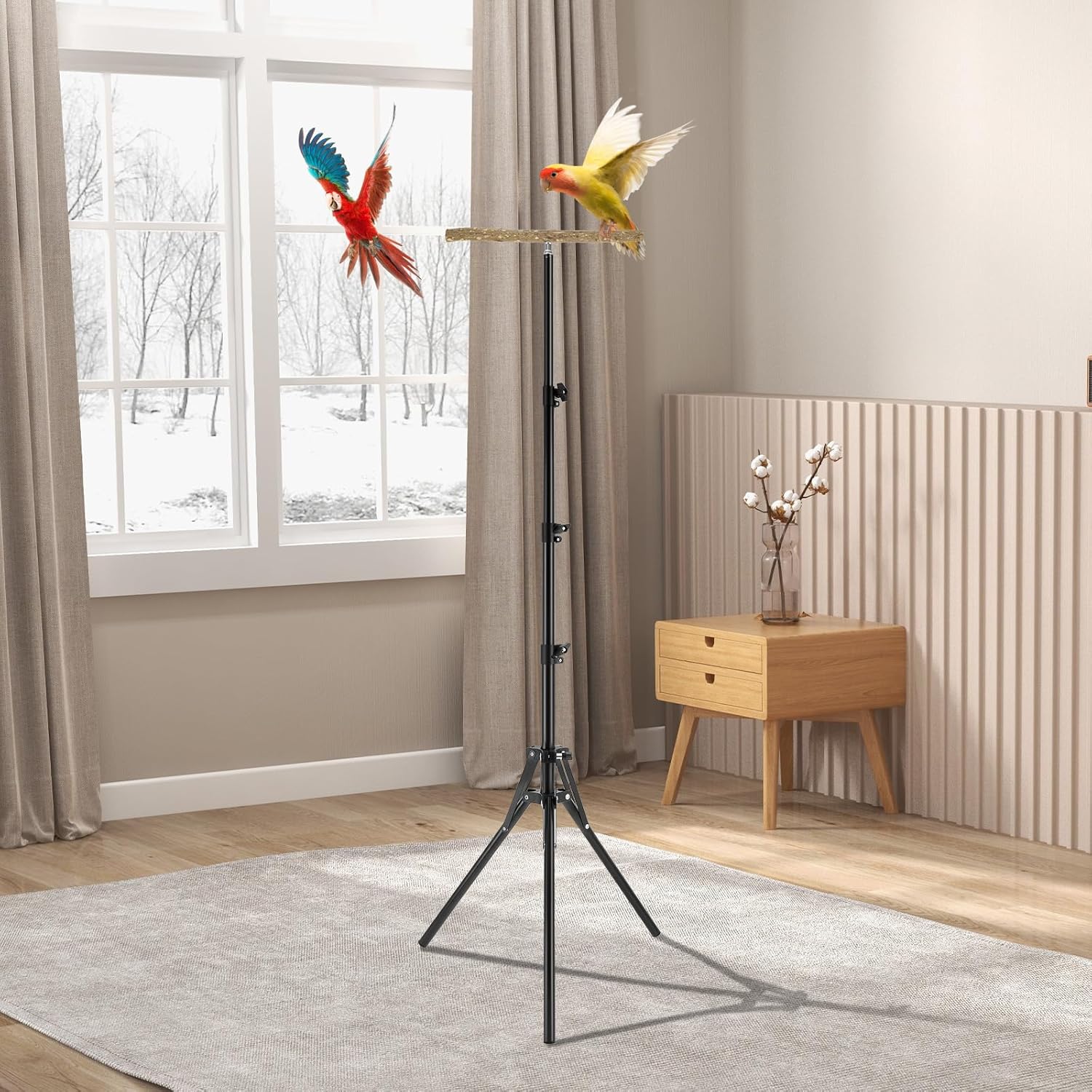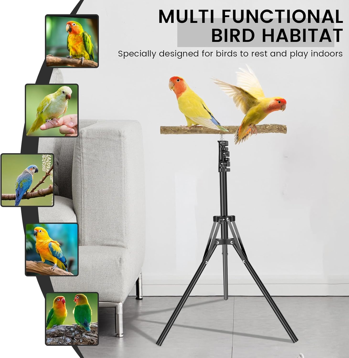 This bird perch has an adjustable height ranging from 16 inches to 63 inches. It is suitable for both indoor and outdoor use, providing a safe and comfortable place for your birds to play