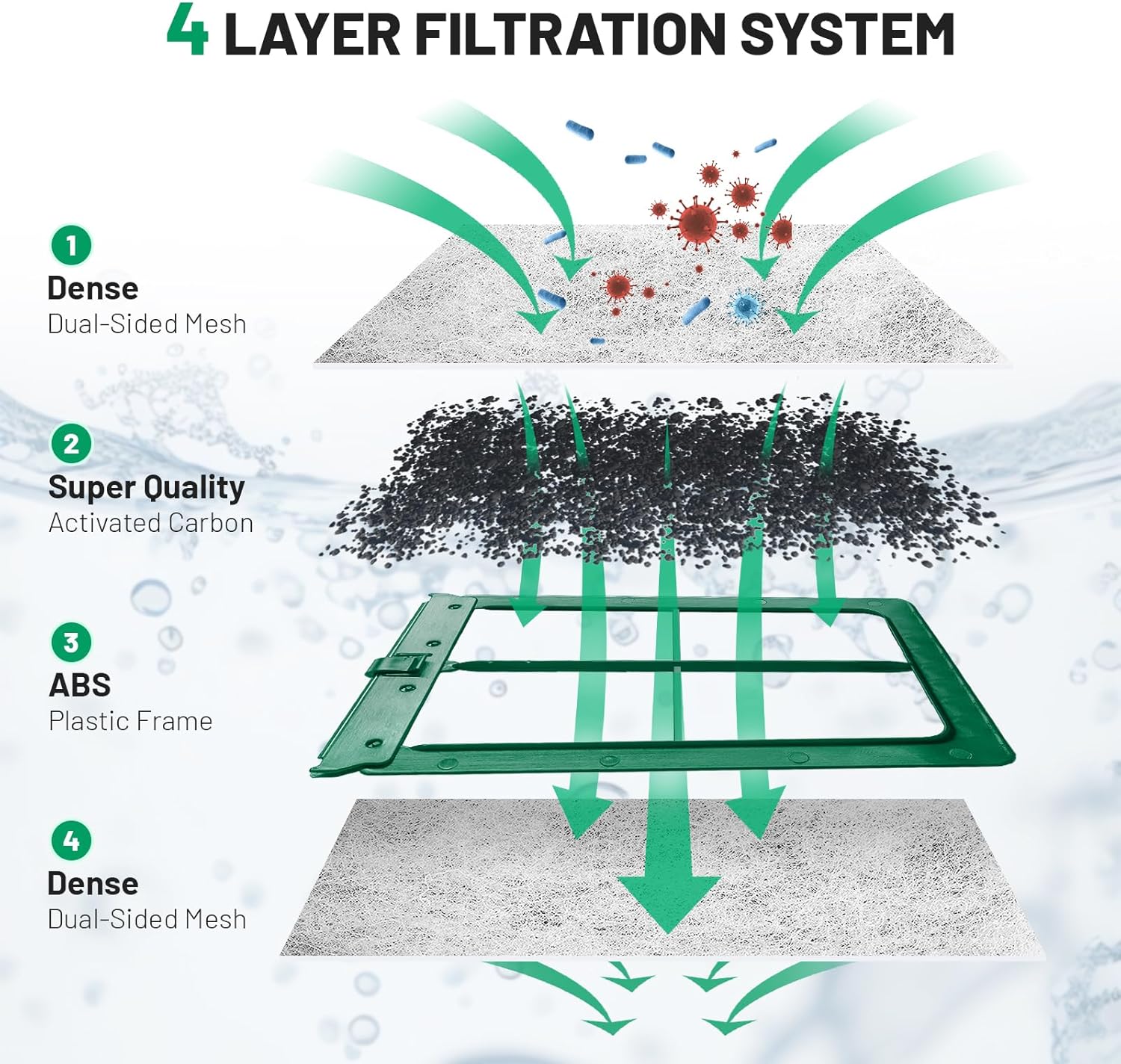 【Durable design, durable stability】 : Built-in ABS frame, uniform distribution of activated carbon and filter media, to ensure that every drop of water is fully filtered. ABS plastic edges are more durable and resistant to deformation, making them a perfect fit for Whisper filters