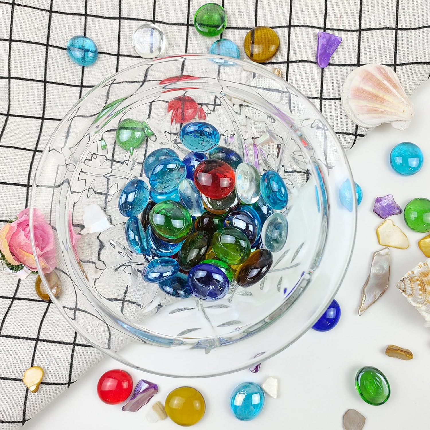【100Pcs Flat Marbles】Mixed color flat marbles consist of dark blue, light blue, yellow, red, green and clear,1 pound glass pebbles approx 90-100 pcs. Each diameter is about 0.7-0.8 inch