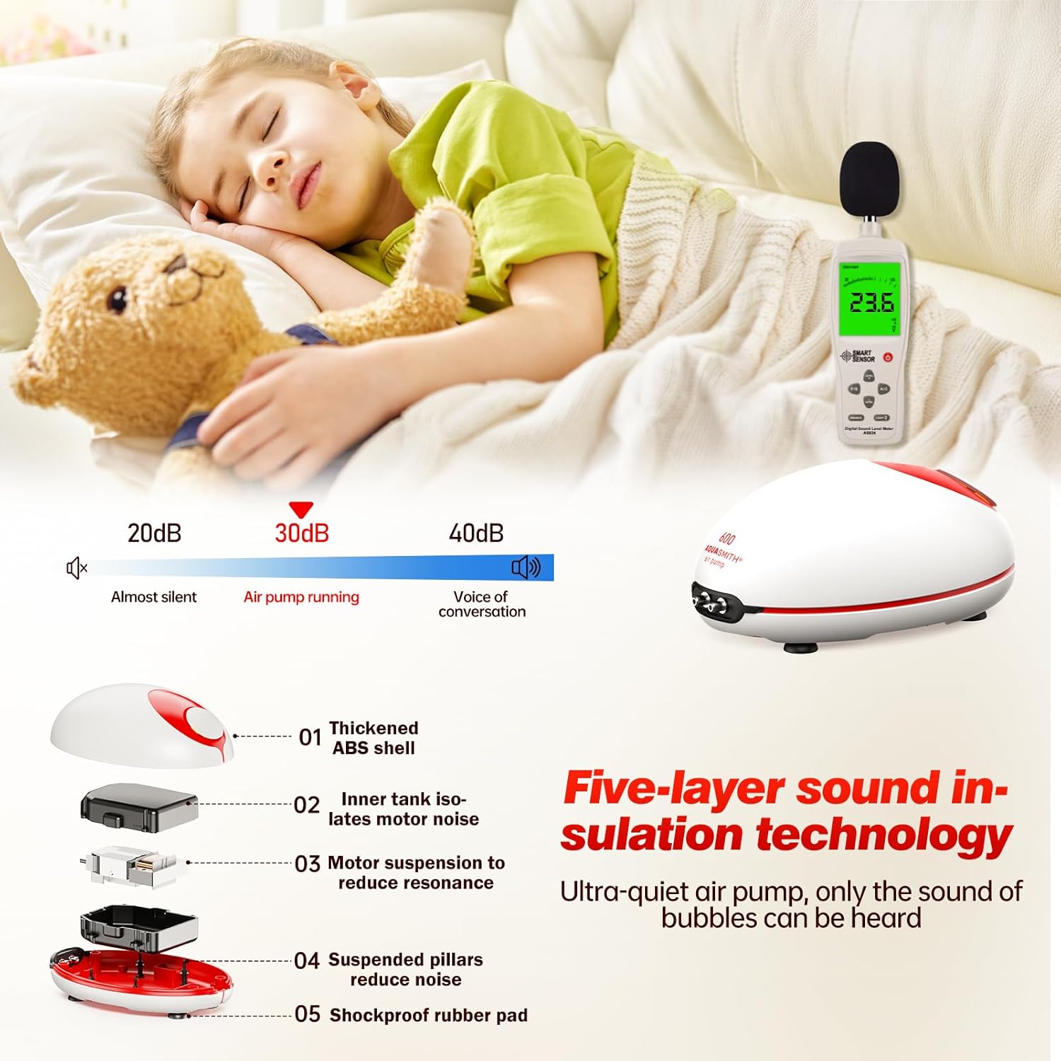 “This air pump operates extremely quietly, with virtually no noise. Compared to other air pumps on the market, it incorporates multiple noise reduction technologies, delivering superior quiet performance.”
