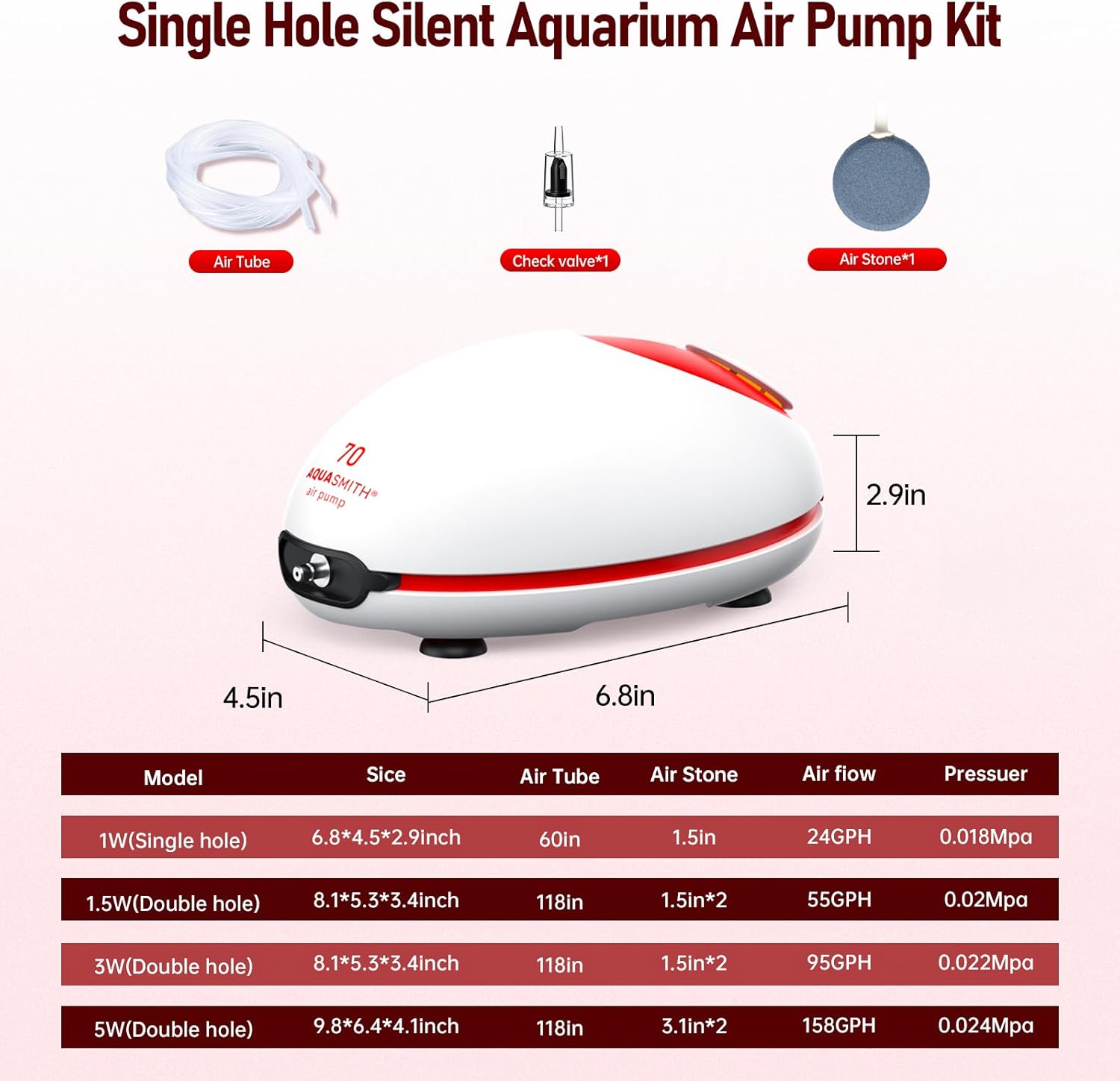 This 1-watt single-hole aquarium air pump performs well. Its air flow is 24 gallons per hour, providing sufficient oxygen for the tank. The air pressure is 0.018 MPa, Suitable for fish tanks from 0 to 40 gallons, stable and moderate, ensuring a reliable gas supply without overloading the tank.