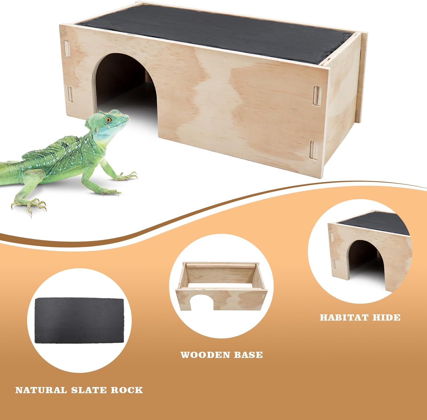 【Durable and Safe】: Made with smooth-finished wood and a real slate top. No sharp edges, no coatings—just safe, sturdy materials for your reptile to explore.