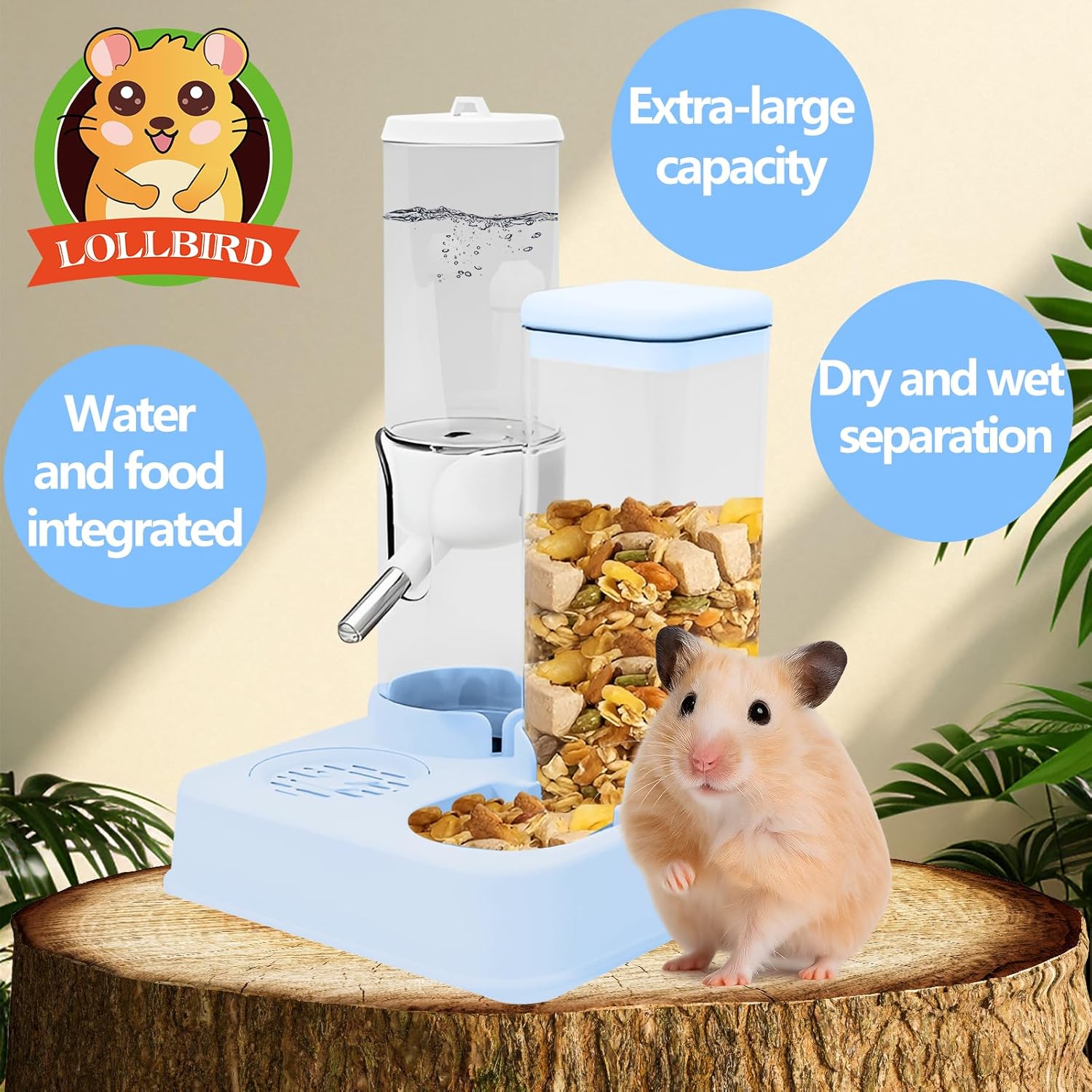 2-in-1 Hamster Water Bottle & Enhanced Food Dispenser – 35% Larger Food Capacity, Leak-Proof Design for Glass Tanks/Wire Cages Small Animal Accessories (Blue, 4.9IN+5.1IN+5.7 in)