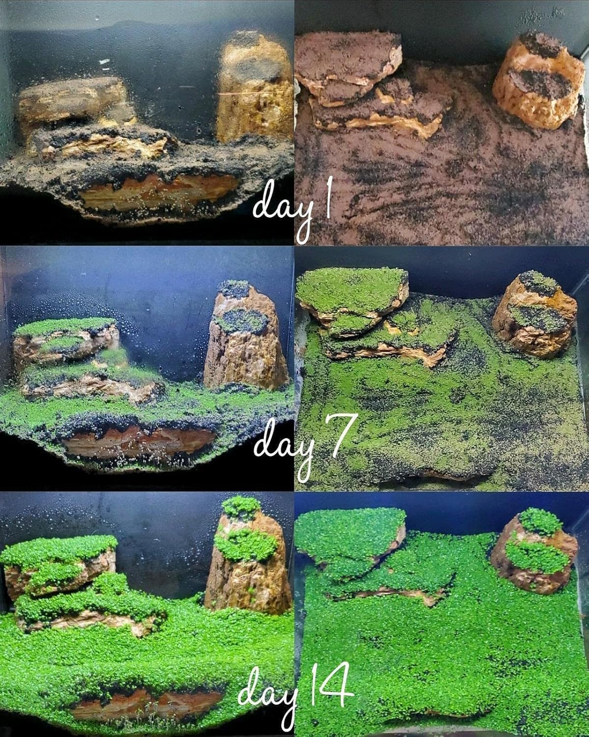 I planted the seeds on a sunday night while bored, i was kind of discouraged by the instruction, i thought it would be hard but boy was i wrong. Dumped contents in my fish tank, turned the heater to 83 degrees and wow 3 days and its growing nice. First 3 day pictures right now its Thursday my tank is bright and colorful and completely covered in greed
