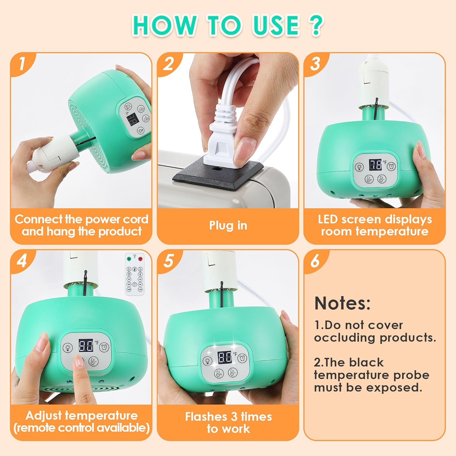Package Includes: you will receive 2 piece of chicken coop heater, 2 power cord and 2 remote control; This chicken heater provides a warm and comfortable environment for chicks by gently heating the air, safe and warm, wide angle warm air distribution is even, soft and comfortable, help them maintain the temperature appropriate for the juvenile stage or the cold season