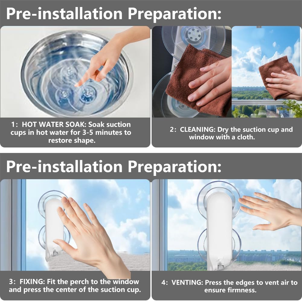 【Quick Installation & Usage Tips】 No tools are required—just attach to any smooth window surface. For best adhesion, soak suction cups in warm water (85–95°F) for 2–3 minutes, dry completely, clean the window, and press firmly for 30 seconds before use