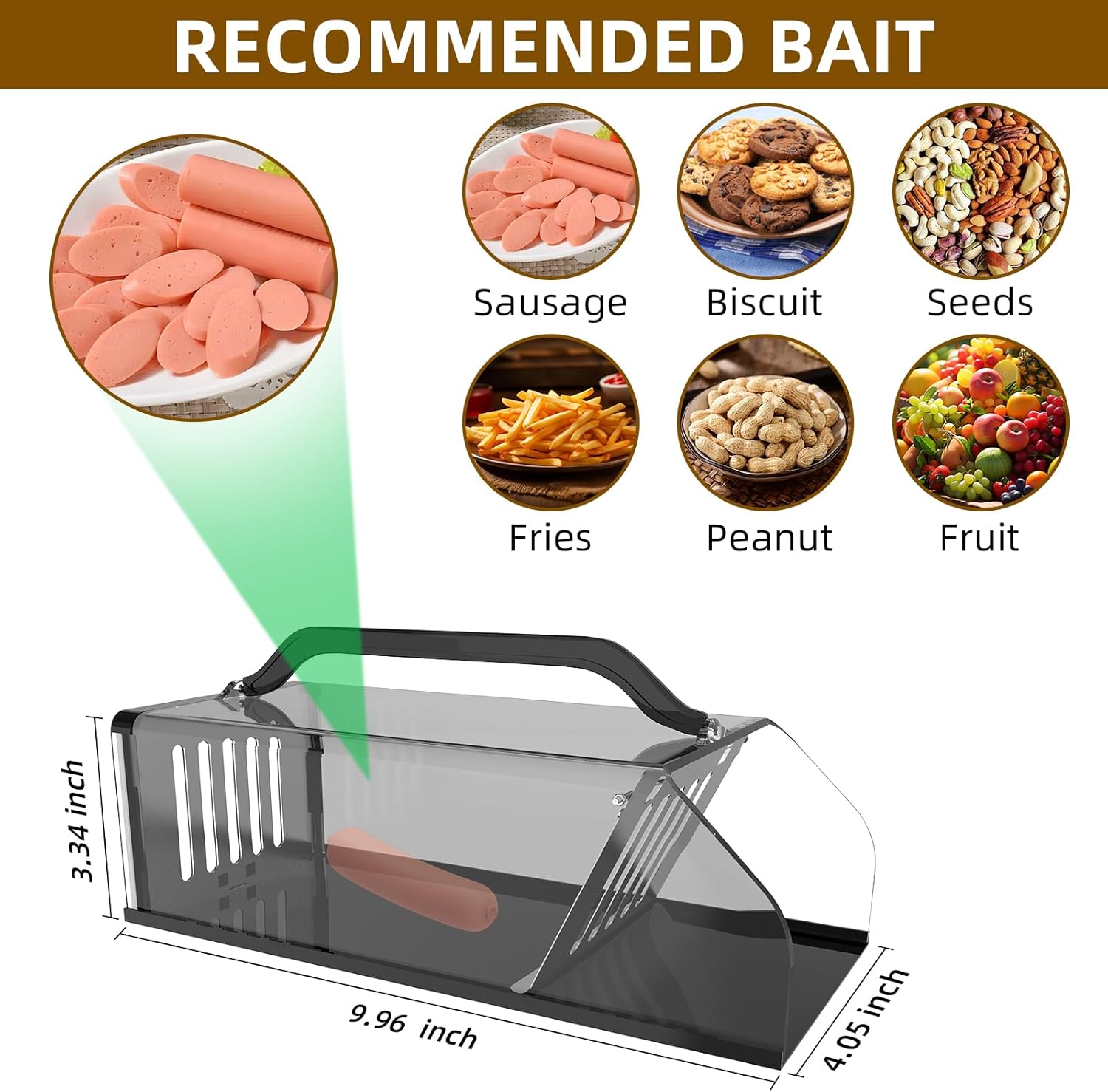 Upgraded Live Animal Trap: Designed with a one-way door system, the mouse trap can continuously capture multiple mice. Our chipmunk trap is easy to use and set. Innovation, reliable, reusable, efficient, widely recognized by users. Size: 9.96*4.05*3.34inch