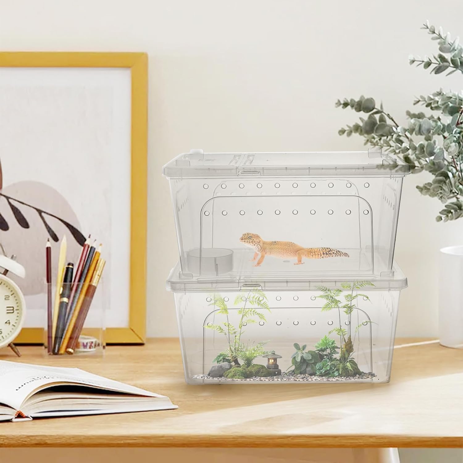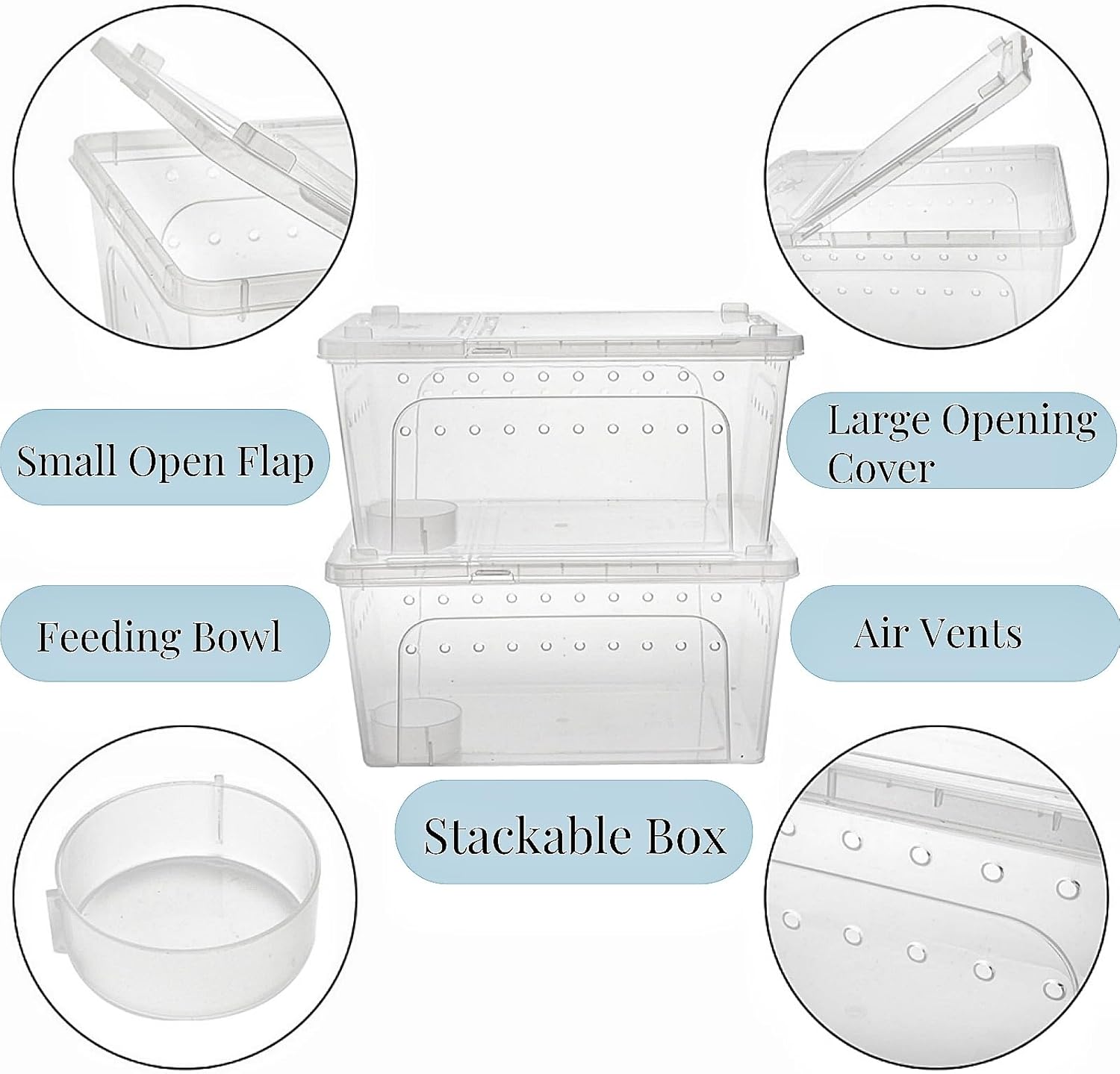 Transparent and Stackable Design: The portable reptile terrariums provide a full 360-degree field of view and offers sufficient observation space to facilitate your approach to pets and to observe animal behavior. The feeding box is built with interlocking tabs on the top 4 corners for easy stacking without collapsing.