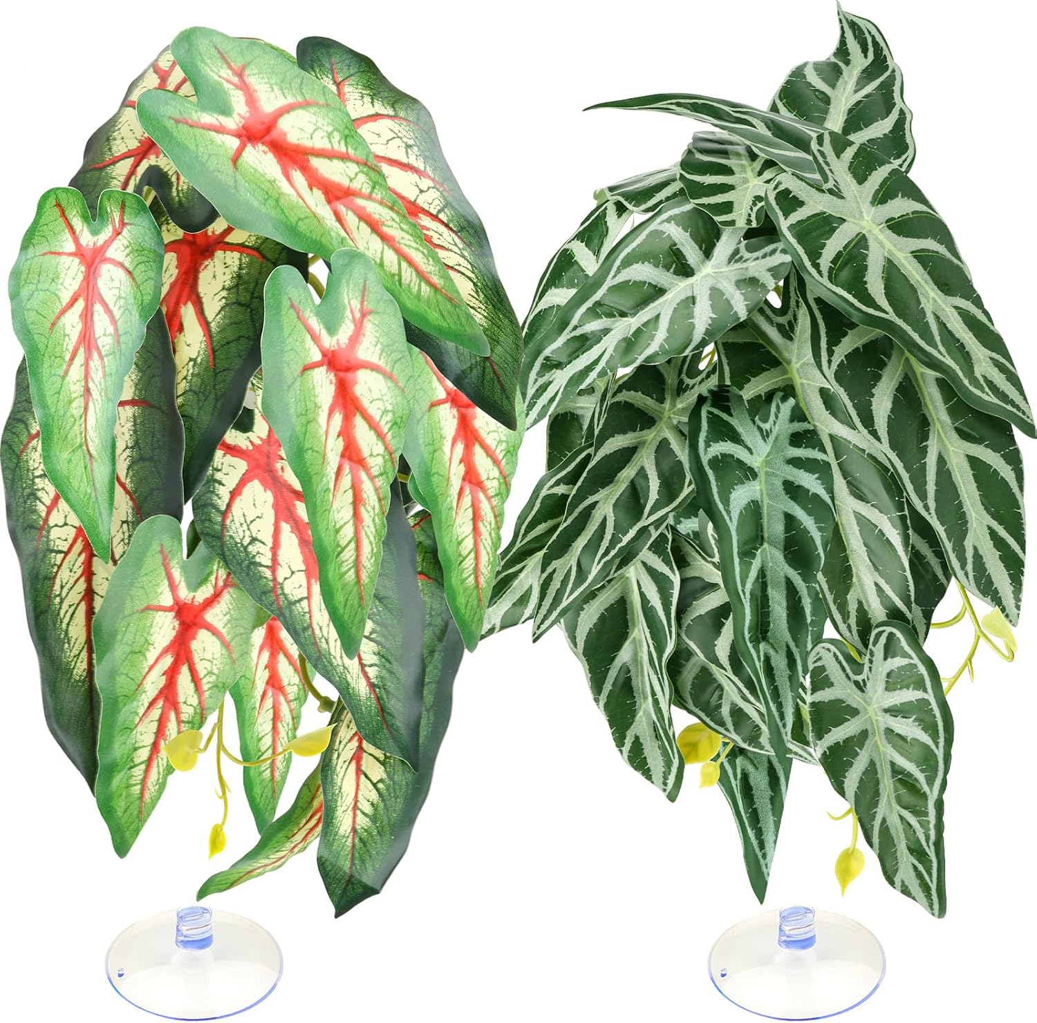 QUOZUO 2 Pack Reptile Plants for Terrarium, Artificial Leaves Habitat Decorations with Suction Cups, Terrarium Hanging Plants Vines for Bearded Dragons Lizards Snake Geckos Frogs – red and white