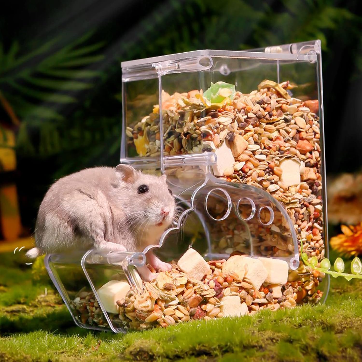 SPLASH-PROOF BAFFLE DESIGN: Automatic hamster feeder use a baffle at the exit to effectively prevent grain overflow. Prevent your pet from accidentally tipping food and keep the feeding environment clean and save cleaning time. Arc-shaped automatic slide down design, automatic food addition, no food jam, automatic feeding, leak-proof and splash-proof, convenient feeding.