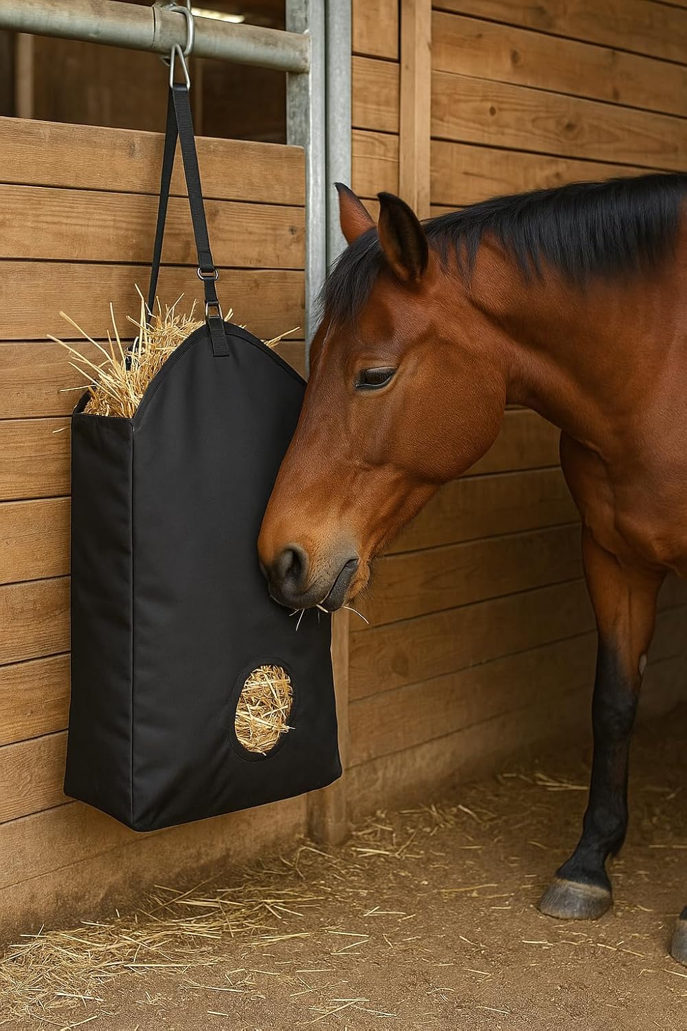 【No Waste Slow Feed Design for Cleaner Feeding】 This slow feed hay bag for horses keeps hay inside until eaten through round holes or the top opening. The solid Oxford sides and base prevent hay from spilling or scattering, reducing waste and keeping barns, trailers, and stalls cleaner. Hay feeder for goats, rabbits, or any livestock needing cleaner feeding spaces