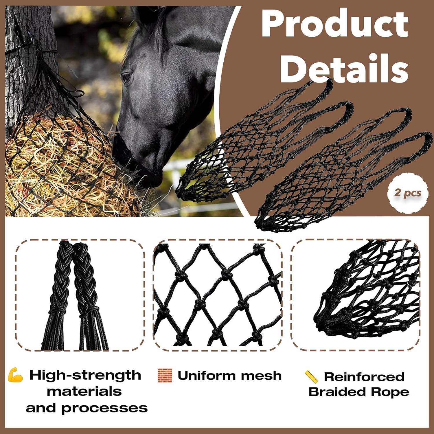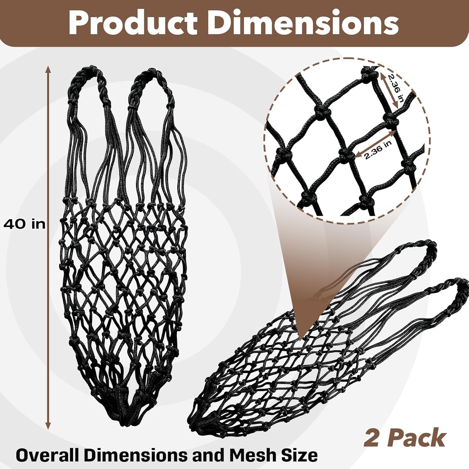 Packaging contents:This Ultra Slow Feed Hay Net features 2.36″x2.36″ holes to promote natural chewing rhythm and improve digestion, the set includes 2 hay net for easy and safe filling