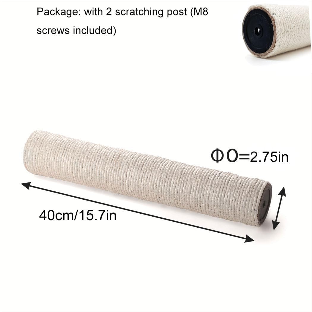 Installation steps:You just replace the cat tree scratch post that needs to be replaced and remove it, and you can connect cat scratch replacement poles to the cat tree with screws, or you can use double-headed screws to connect two replacement scratching posts to achieve higher heights, it is a normal size that fits most cat tree.(Tips:You do have to be careful to pick the same screw thread ,These a M-8)
