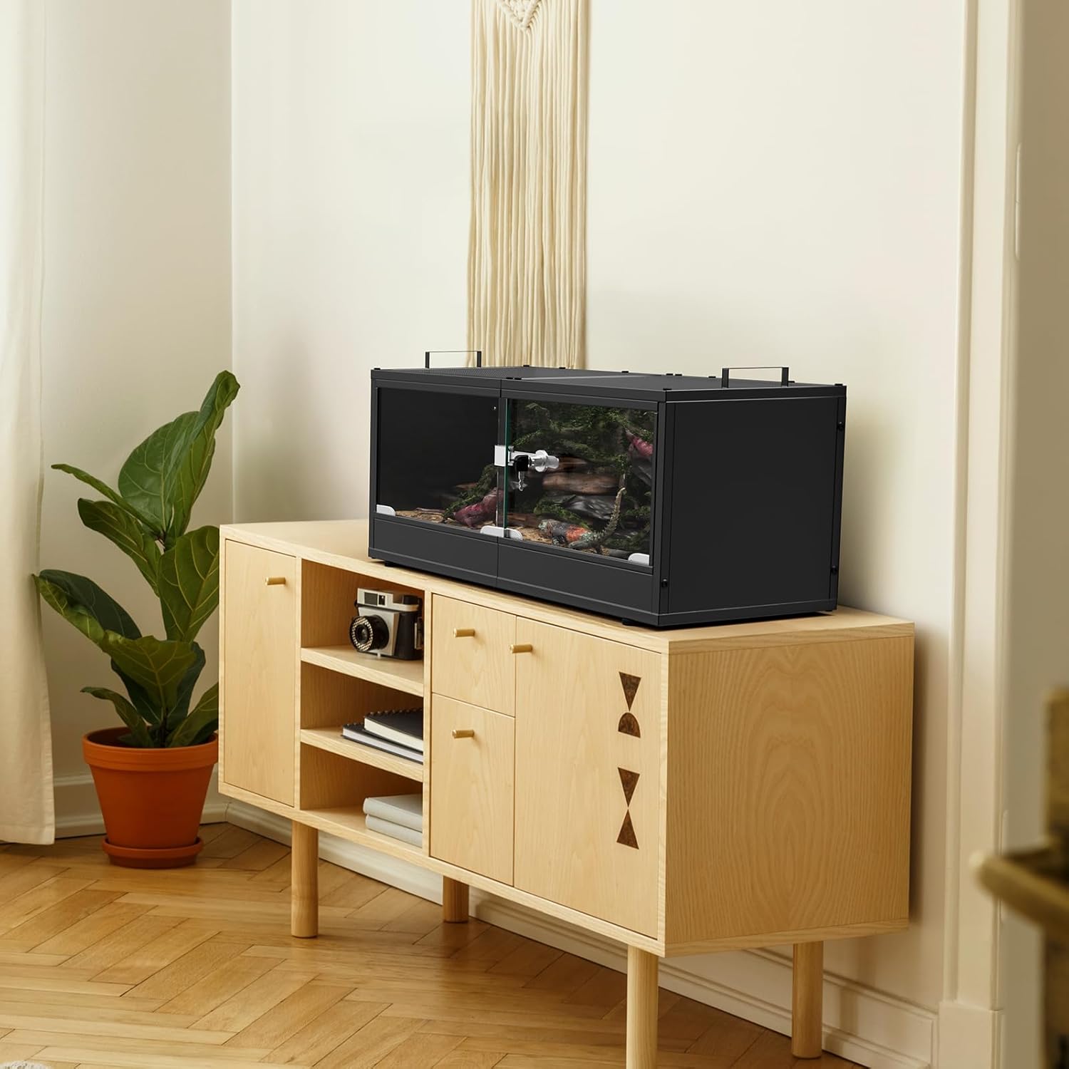 Constructed with a heavy-duty all-metal frame and smooth sliding glass doors with a secure lockable clasp, this terrarium prevents escapes and safely houses even aggressive reptiles and pets.Ergonomic carry handles allow for easy and stable transportation, making it simple to reposition the enclosure for cleaning or redecorating without effort.Dedicated side cable ports enable tidy and safe installation of heat lamps, thermostats, and other electrical equipment while protecting cords from pet damage.