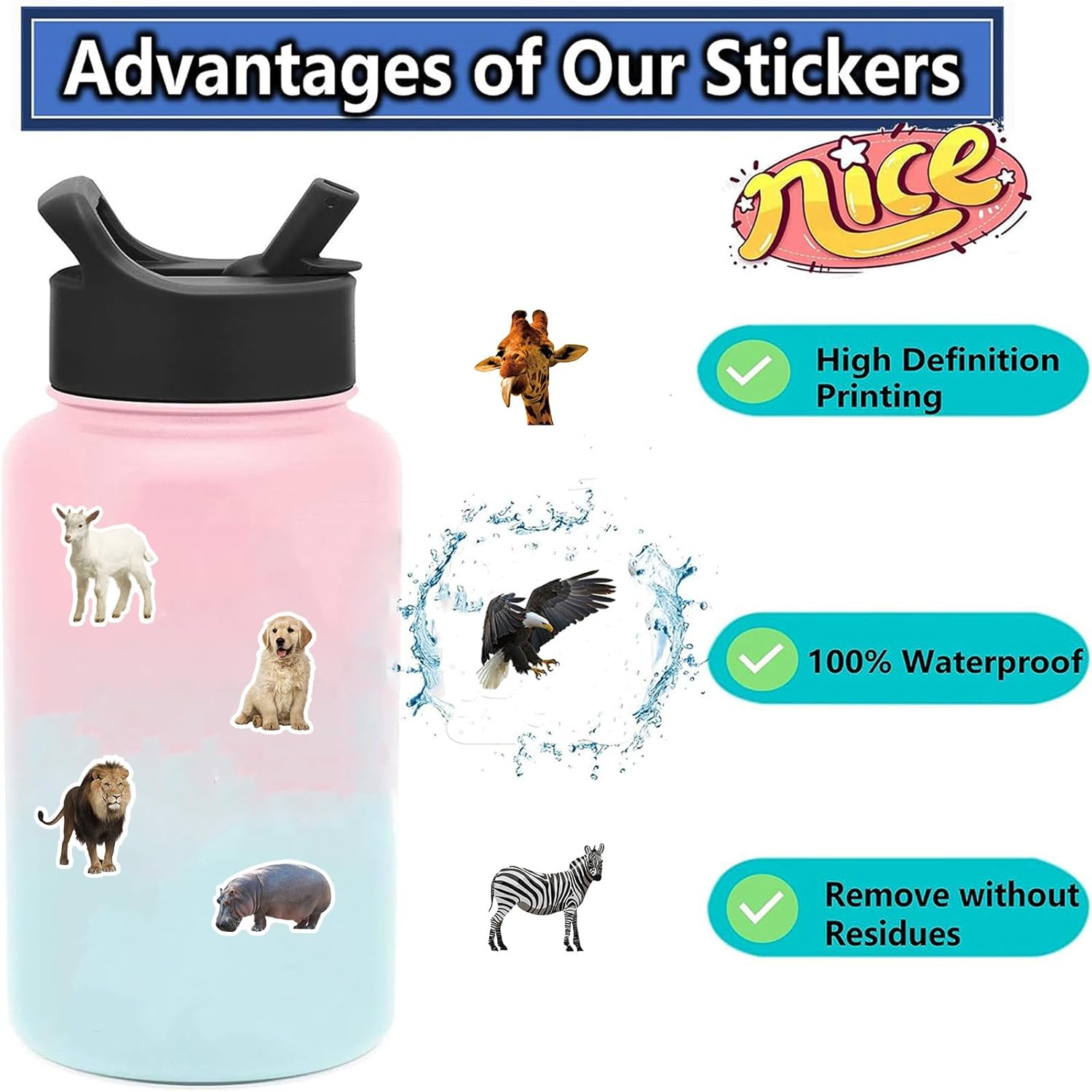 What You Get: The packaging contains 200pcs real animal stickers for kids, measuring around 2.0-3.5 inches with irregular patterns which are were clear and well printed,colorful and vivid.These water bottle stickers are self-adhesive and very adorable.