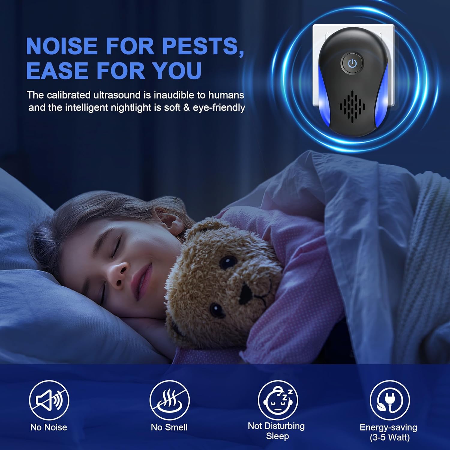 Sound Level & Effectiveness: Silent to humans, effective for general pest control-ideal for nighttime use.