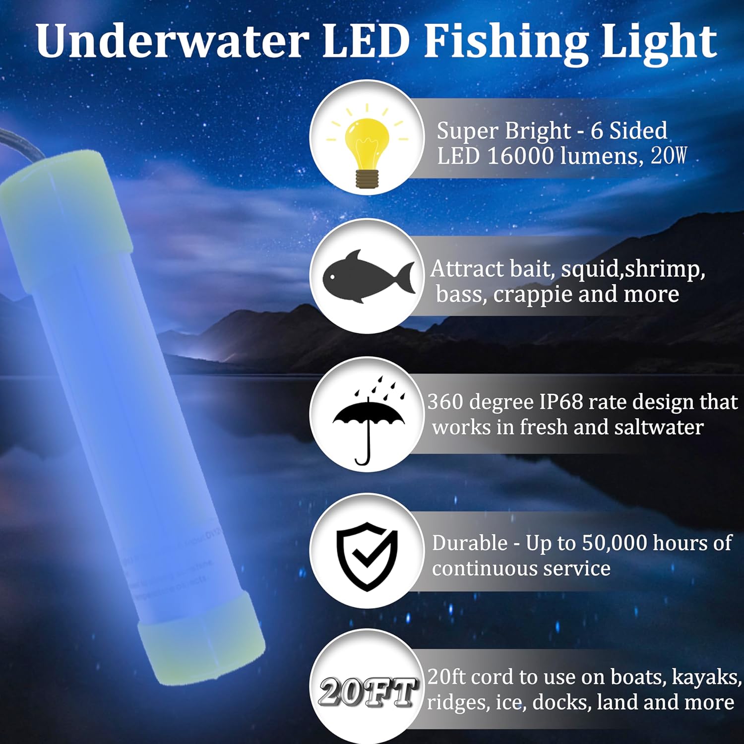 【SUPER BRIGHT FISHING LIGHT】20 watts, Super Bright 16000 lumens brightness, bright with good penetrability, 6 Sided LED Fishing Light (360 degree view); Attract prawns, squid, and fish to your favorite spot with these super bright led fishing lights