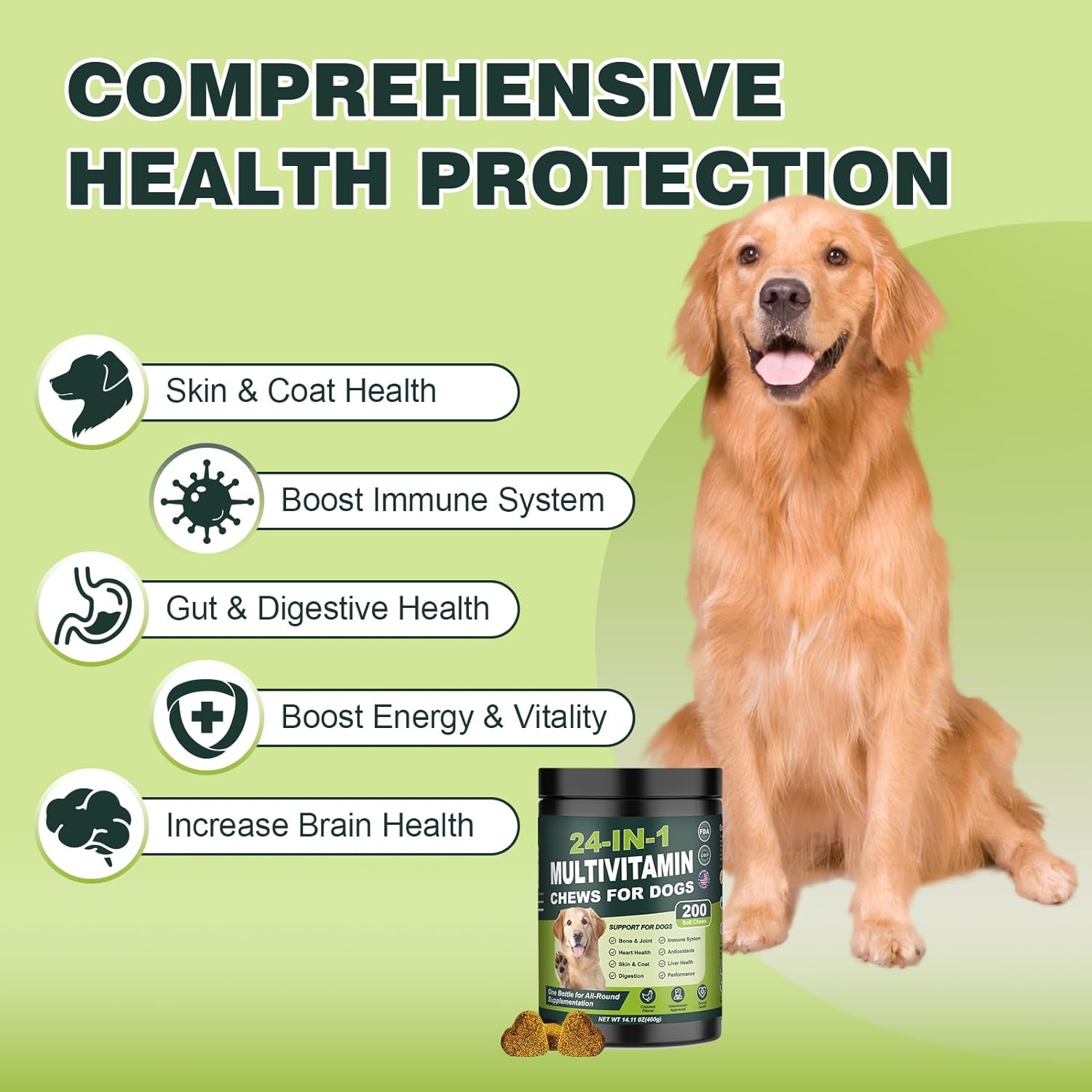 24-in-1 Dog Vitamins and Supplements 200 Ct Multivitamin for Dogs Chewable Contain Glucosamine Chondroitin Probiotics Omega-3 for Skin Coat,Hip & Joint,Heart,Liver,Brain,Eyes – Suitable for All Dogs
