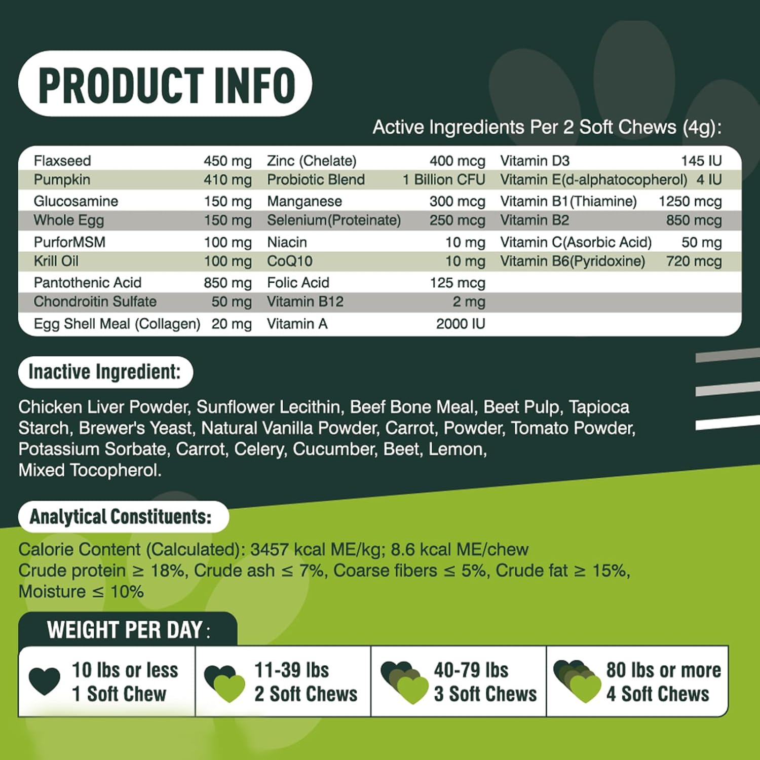 Dog multivitamins chewable includes glucosamine, chondroitin,probiotics,Omega-3,coenzyme Q10,etc.Multivitamin for dogs can promote dog overall health and help reduce the risk of nutritional deficiencies.Dog multivitamin with probiotics helps maintain a healthy gut and digestive system and promotes bone and joint health.Vitaminas supplements for dogs support healthy heart function, skin condition, brain activity and liver function,boost immunity and more!Dog multivitamins ingredients are carefully selected and are soft and easy to chew!