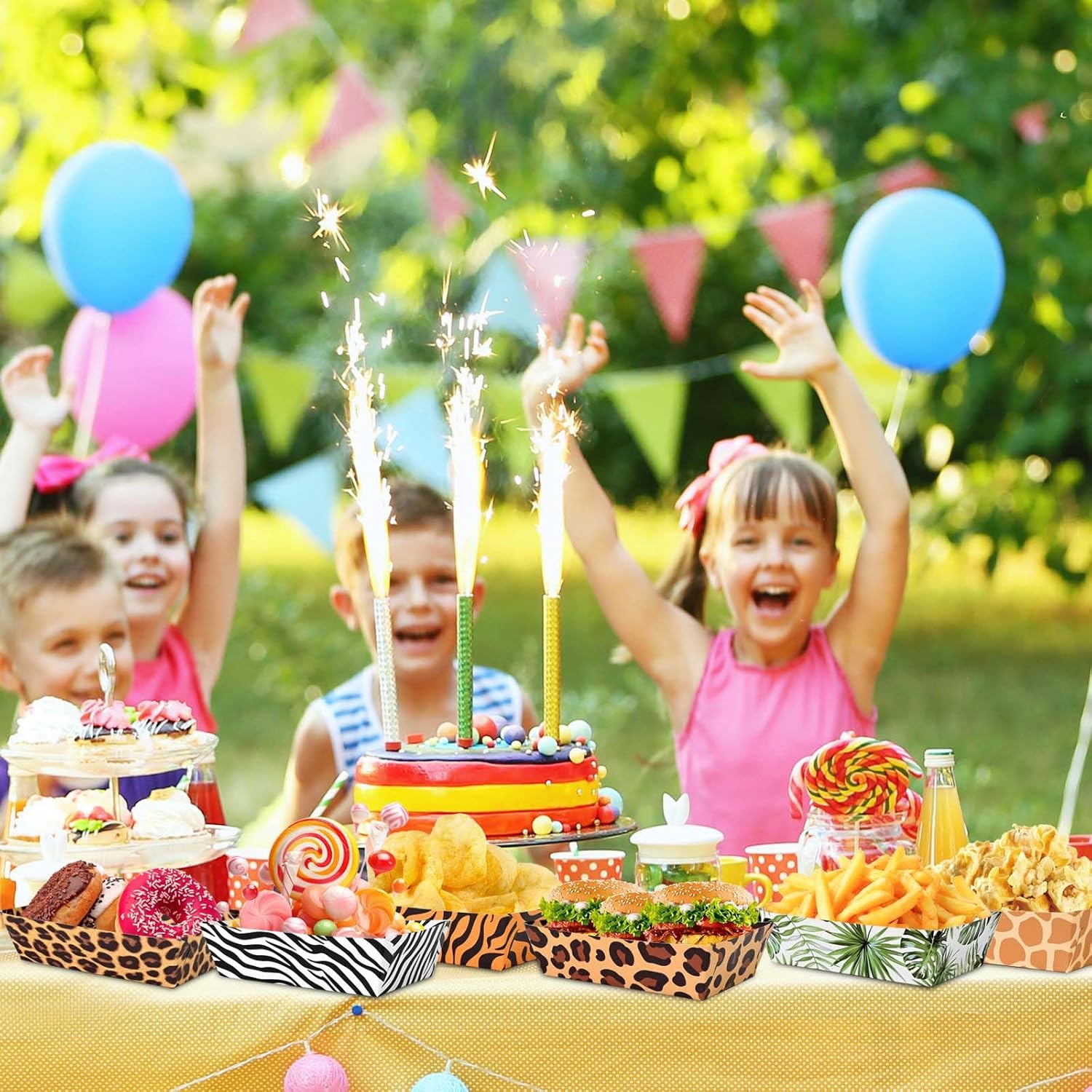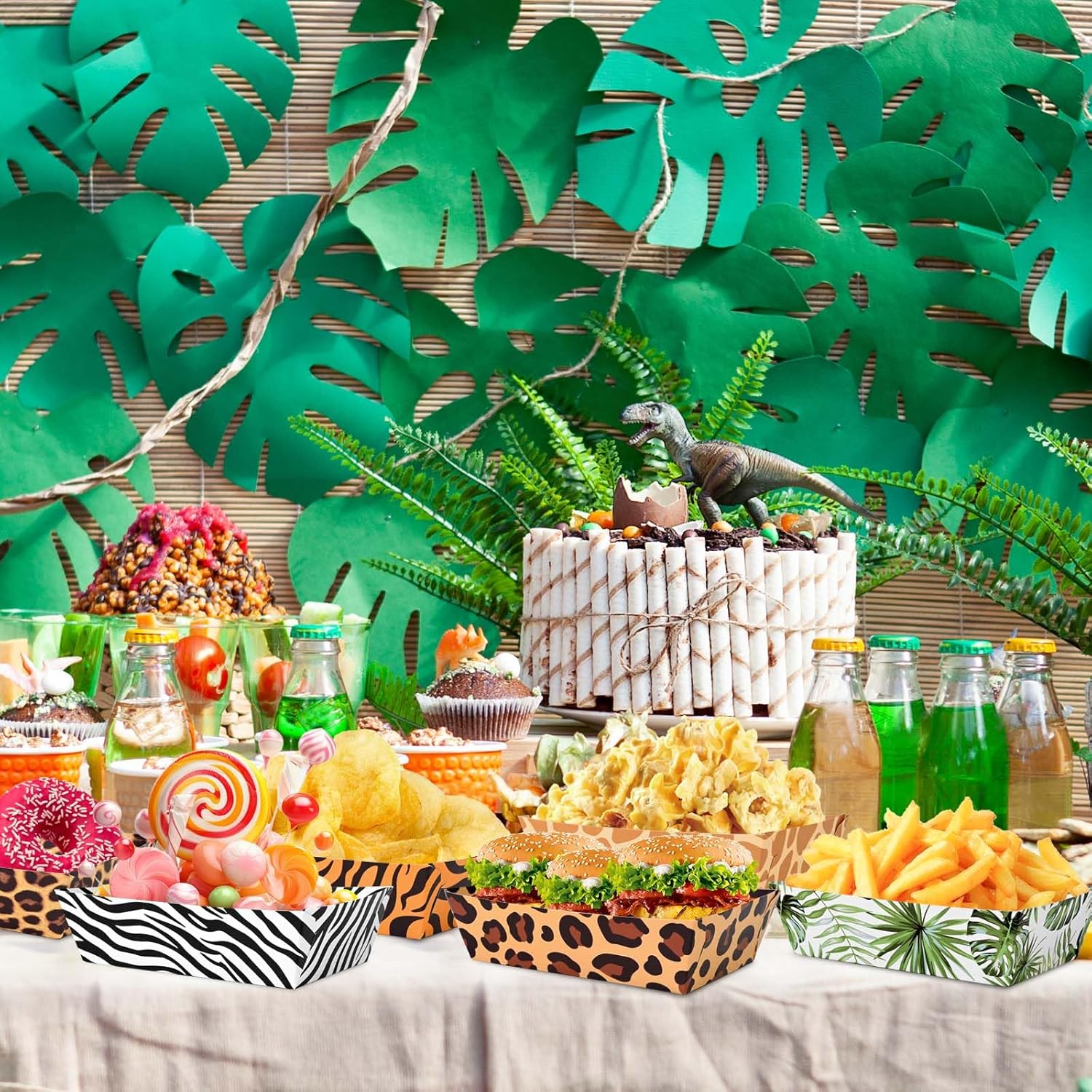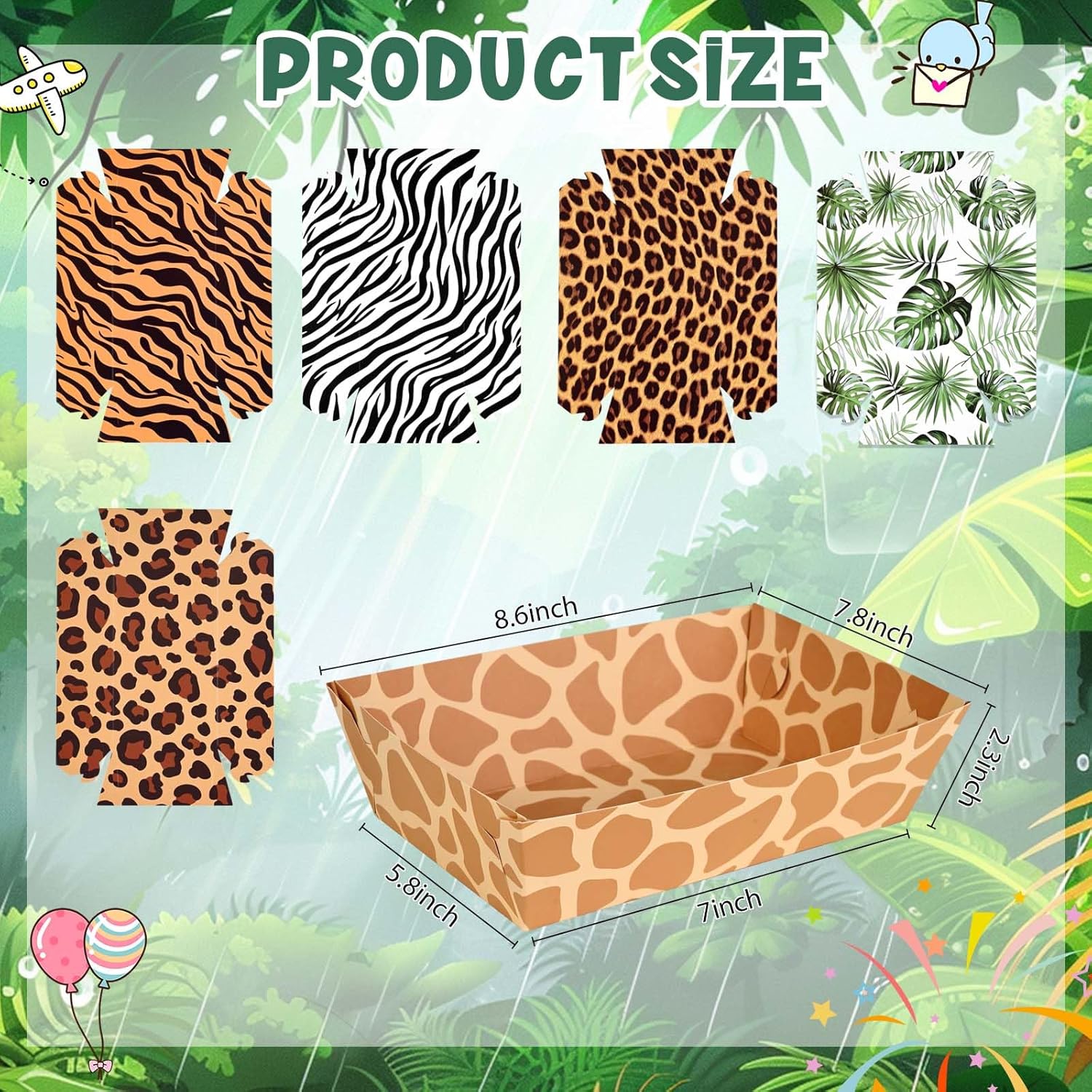 Safari Themed Party Gift: This jungle zoo animal print paper food tray is designed with cheetah spots, zebra stripes, tiger stripes, tropical green leaves, giraffe spots and other jungle hunting theme elements on both sides. The exquisite and attractive charm pattern will bring joy to your party.