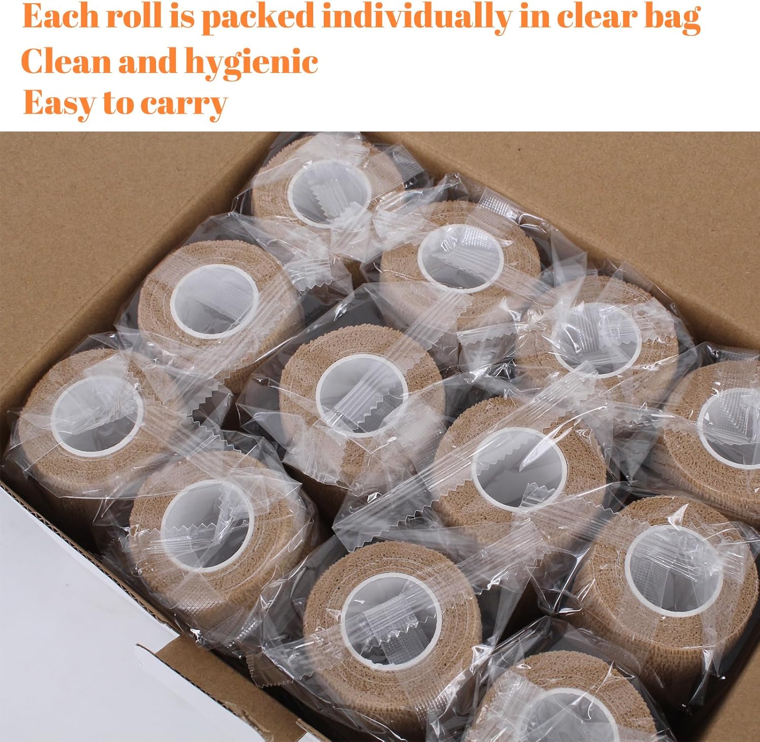 The set includes 24 roll brown self adhesive bandage wrap, each roll of bandage tape is 4 inches wide and 5 yards long; even better, each roll is packed individually in clear bag, making it easy to carry, clean and hygienic