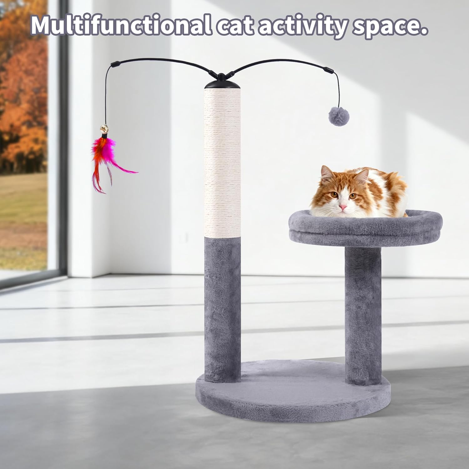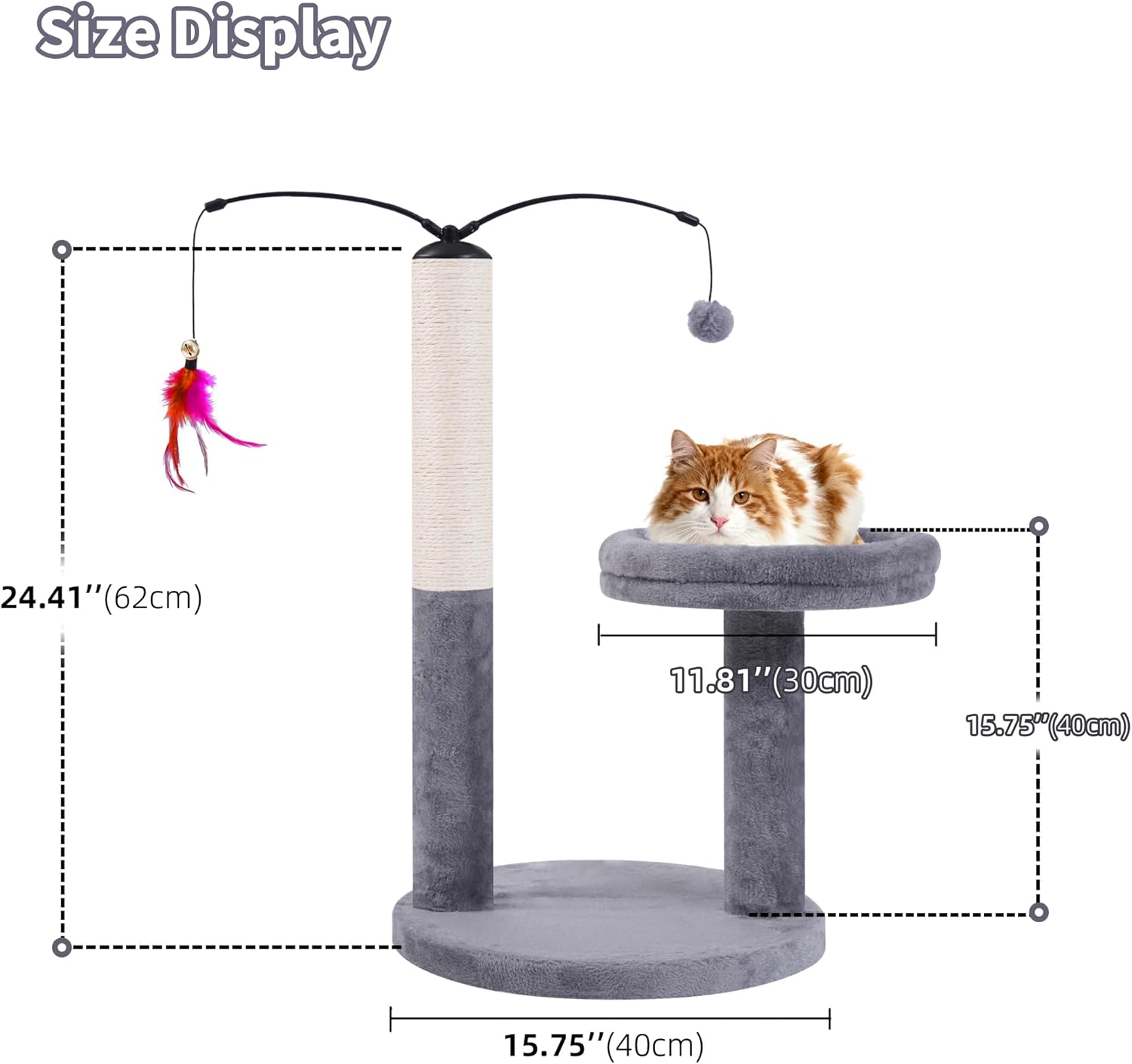 24″ Scratching Post, Interactive Cat Scratcher, with Perch & Plush Toy, Sturdy Weighted Base, Grey