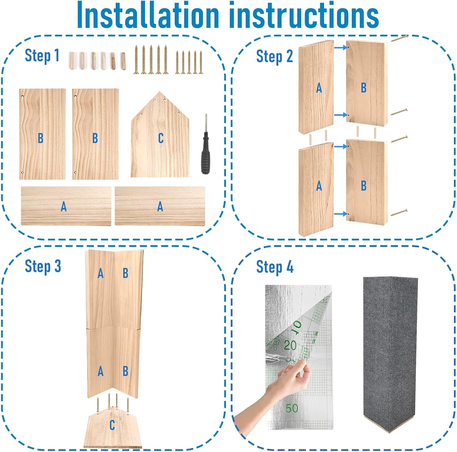 Installation Steps: Please refer to the assembly pictures on the detail page, the package contains 4 long and 4 short screws, 4 splicing wooden sticks (1 more as a spare), firstly splicing the 4 square boards into 2 90-degree parts ,Splice together with wooden sticks to form a whole,and then fixing the triangle base board to the bottom of the cat scratching board with the screws and the corresponding holes, and then finally sticking the self-adhesive cat scratching carpet to the board.