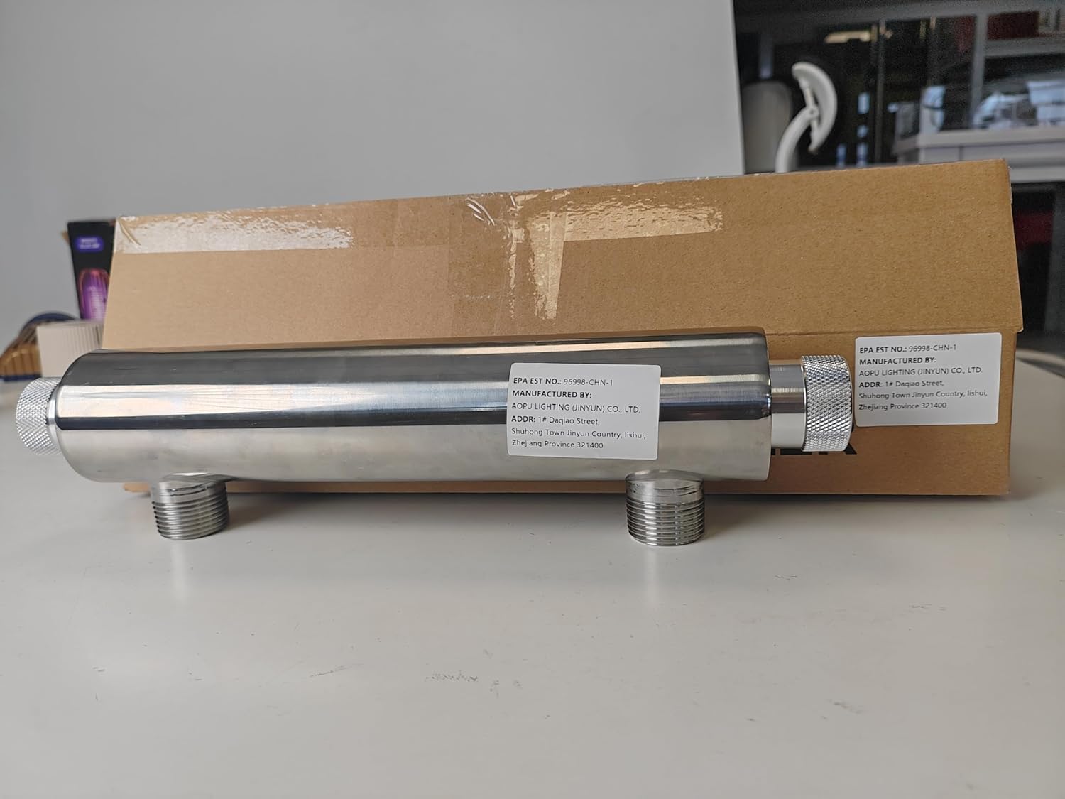 The sterilizer works as expected and seems to be well made.The only issue is that at least part of the item has been used. The cord’s were not factory wrapped and one side of the power supply the cord was not secured. There was salt residue inside the plastic hose fittings. The stainless steel tube did not appear to have been used, as well as the bulb didn’t appear to be used. Not a deal breaker but should not have been listed as a new item. The original box also had new tape over the old.
