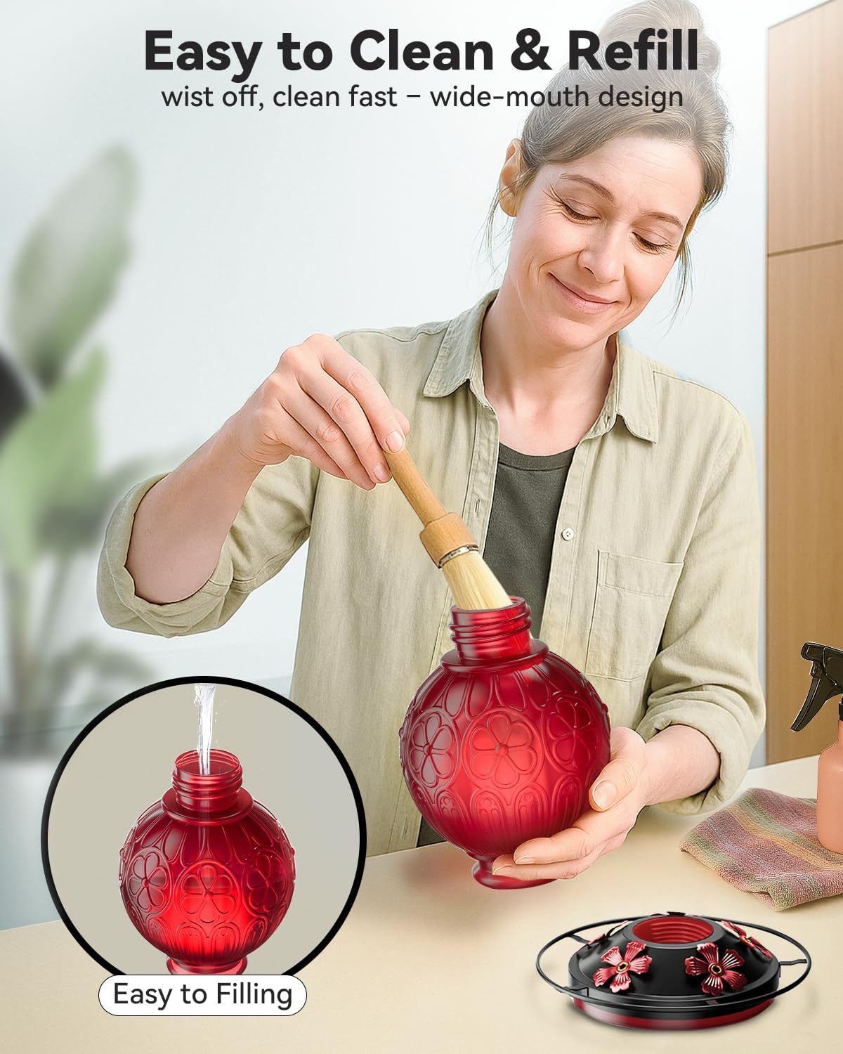 Easy to Clean & Refill – The extra-wide-mouth glass bottle allows for effortless disassembly, making cleaning and refilling simple. The clear glass construction helps you monitor nectar levels at a glance, keeping the feeder fresh and ready for hummingbirds.