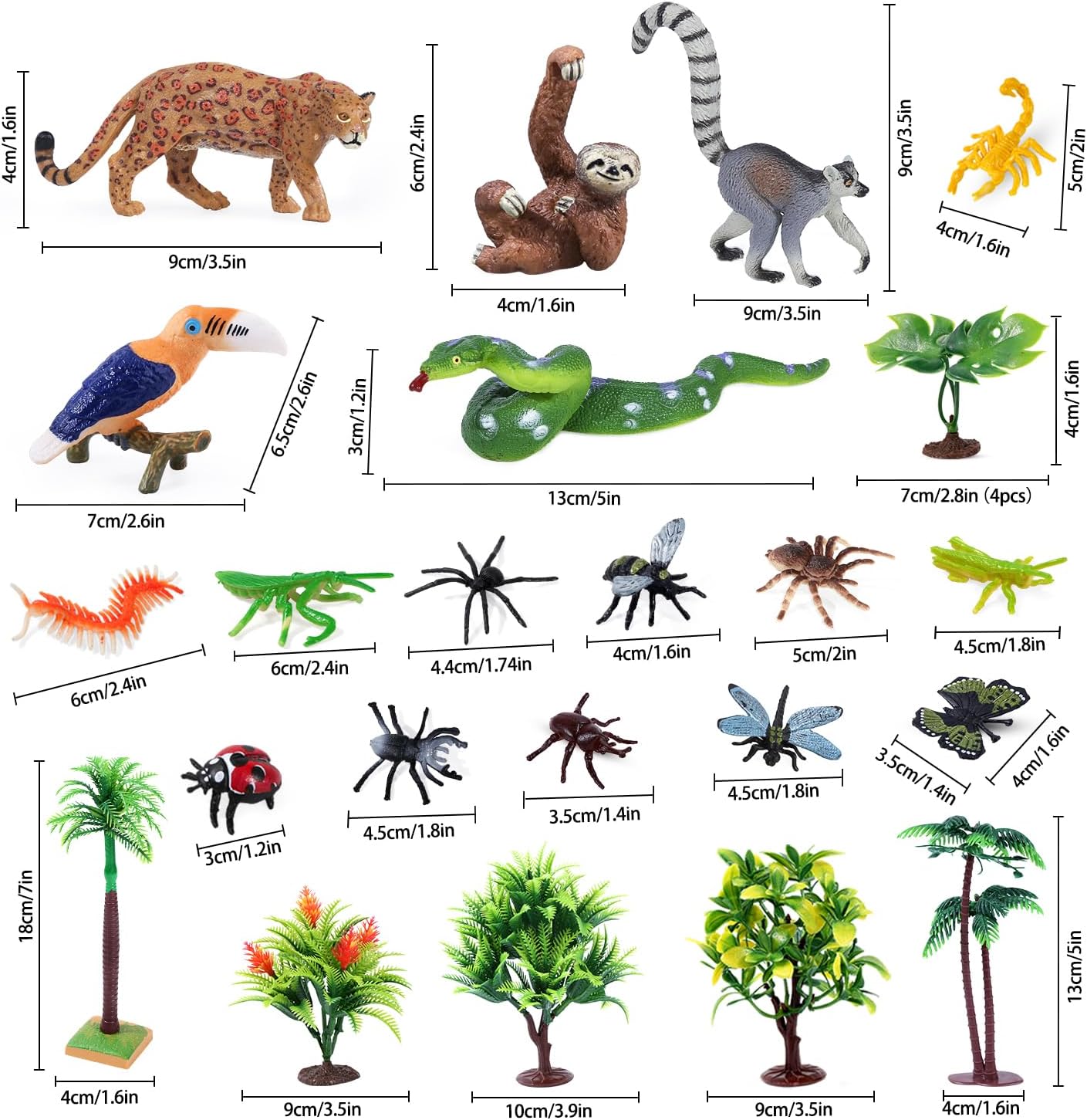 【Realistic Rainforest Animal Figures】- 26pcs unique plastic rainforest animals includes: Snake, Sloth, Leopard, Monkey, Bird, Insects(centipedes, spiders, dragonflies, butterflies, etc.), Trees which have vibrant colors, natural appearance, active poses, each figure is finely hand painted and sculpted by experts.