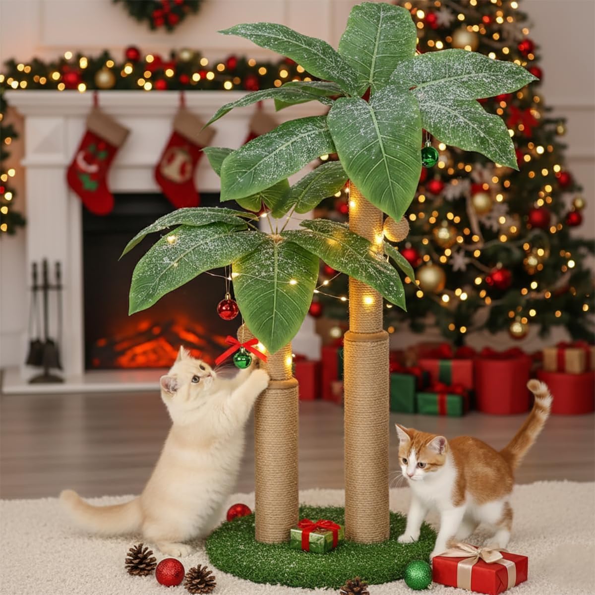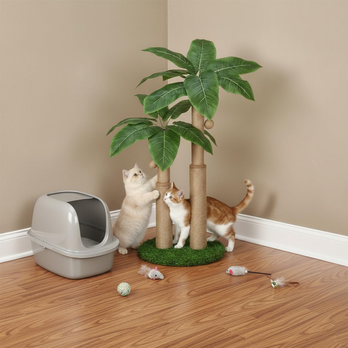 【2 in 1 Design 】:This attractive cat scratching post not only serves as a cat scratcher but also enhances your home decor, measuring 39*39*75.5 cm with two sisal-covered poles, 12 green leaves, and an artificial grass base for a jungle vibe.Add some bright color green to your home!