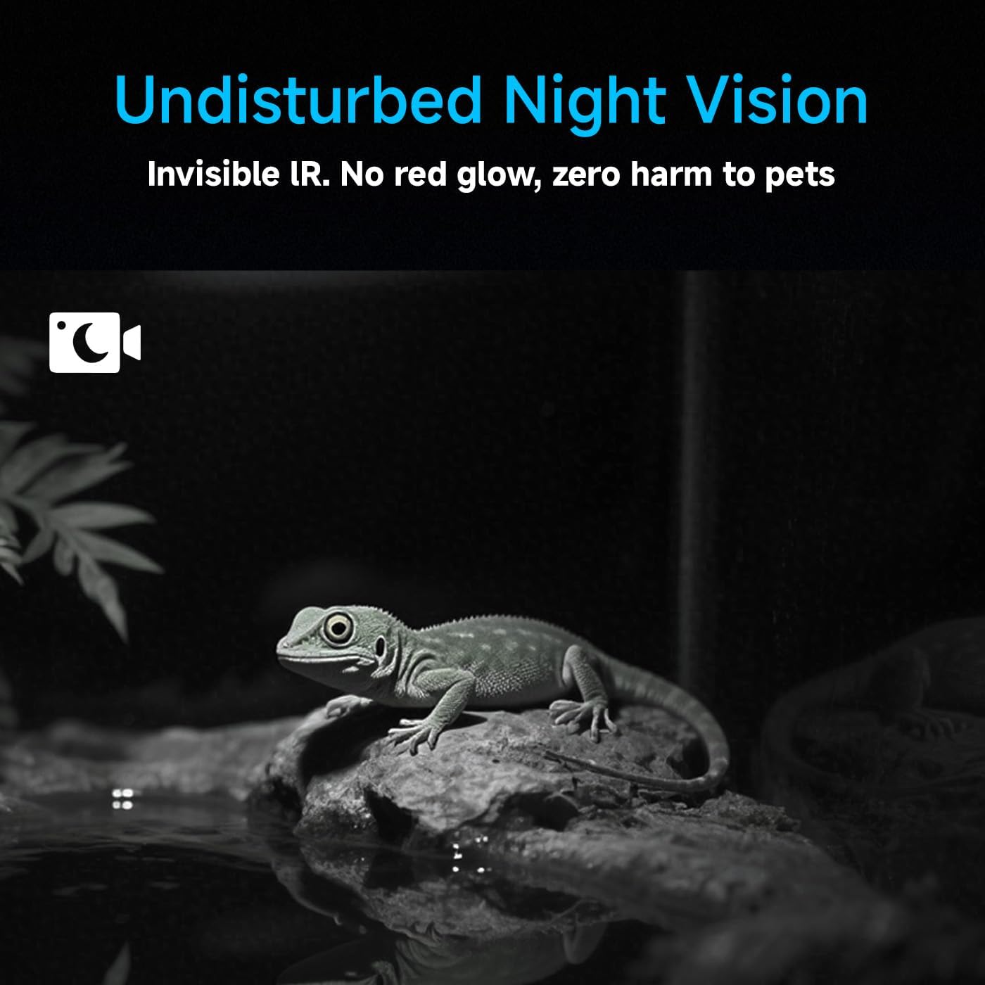 NIGHT VISION & WIDE VIEW:Monitor your fish, reptiles, and amphibians 24/7 without disrupting their natural sleep cycles or delicate ecosystems. Advanced 940nm infrared night vision delivers day-like clarity even in complete darkness—without causing stress to your pets. The 140° wide-angle diagonal view ensures comprehensive coverage of your entire enclosure.