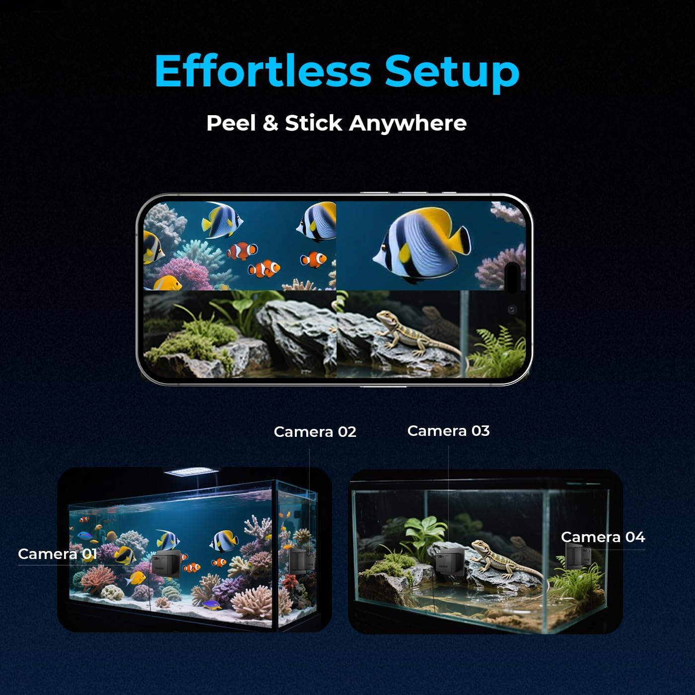 DESIGNED FOR AQUARIUMS AND TERRARIUMS:The ultra-compact 1.46 × 1.46 in. camera is engineered for effortless and secure installation, adhering discreetly and firmly to any glass surface (aquariums, terrariums, vivariums) with its innovative “peel-and-stick” design. Its miniature size ensures it blends seamlessly into your pet’s environment without obstructing your view or their natural habitat. The included mount can also be securely placed anywhere you like.