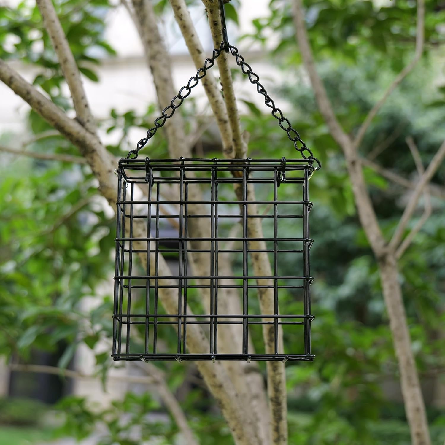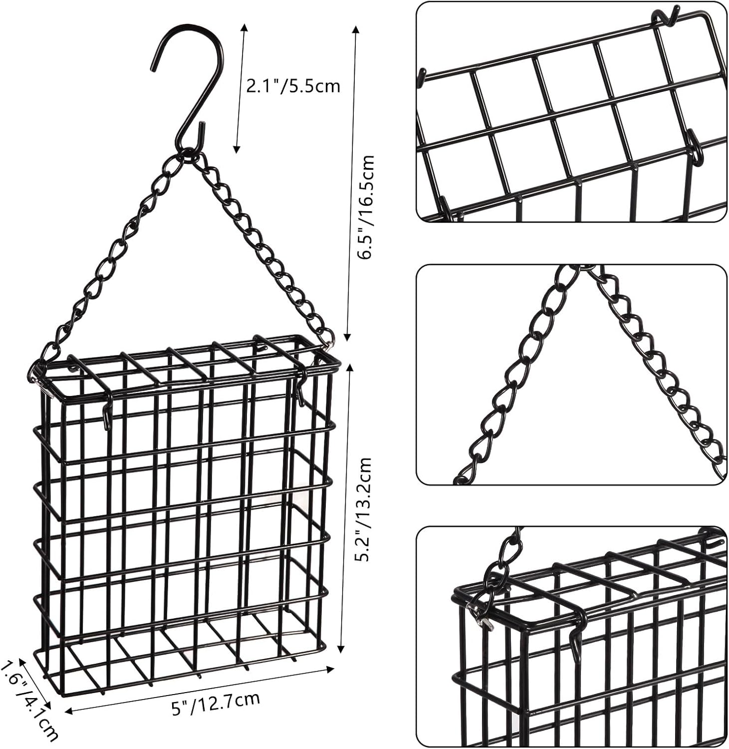 Suet Cage Bird Feeder is 5x 5.2 x 1.6 inch overall size, have 1 suet cake Capacity. Very suit for small seed cakes, nesting materials in spring, and oranges in summer. Open the top of the birds suet cage and put the suet or birdseed cakes in, then close double locking closure system again. Grid design allows birds to attach themselves to cages and feed woodpeckers, walnut incubators, tits, and more. Provide food and energy for winter birds. Made of solid steel material, has strong durability and protected by black anti-rust coating on the surface. Hanging in your garden to watch the birds frolic and add fun to your garden!