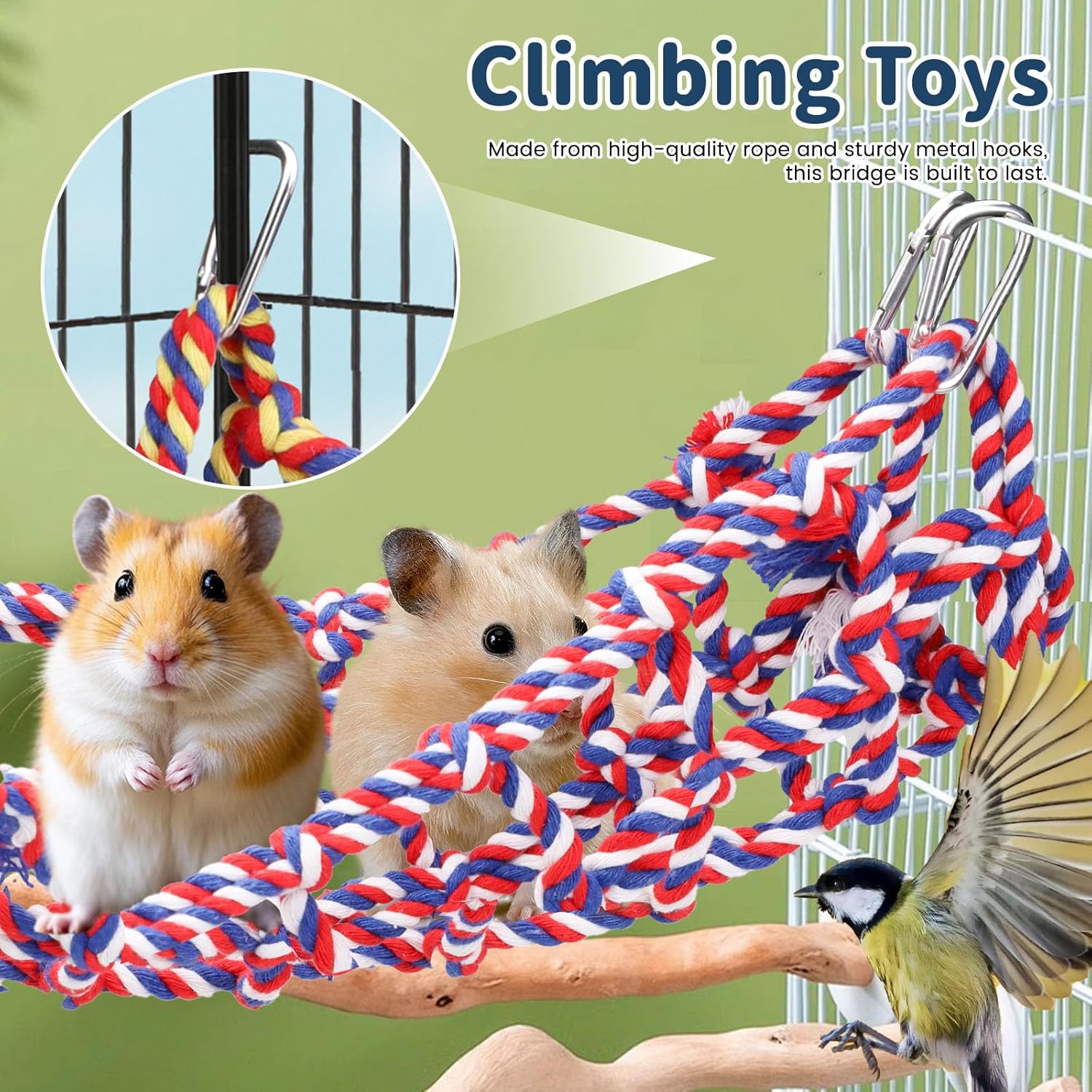 Premium Material: Made from soft yet strong cotton-blend ropes with reinforced stitching, these rat climbing toys are safe for chewing and climbing. The rust-resistant metal hooks provide secure attachment as rat hammock for cage or hanging toys.