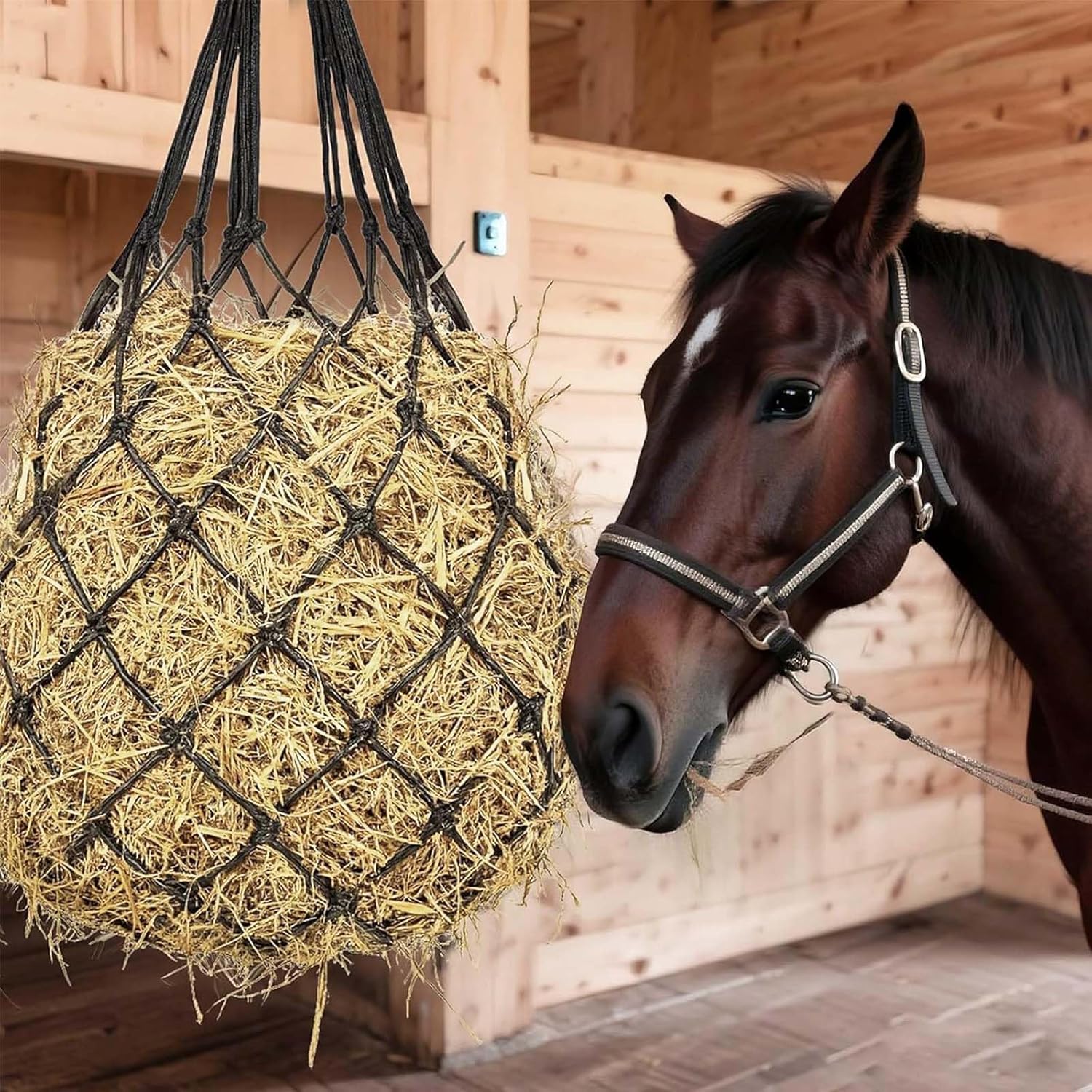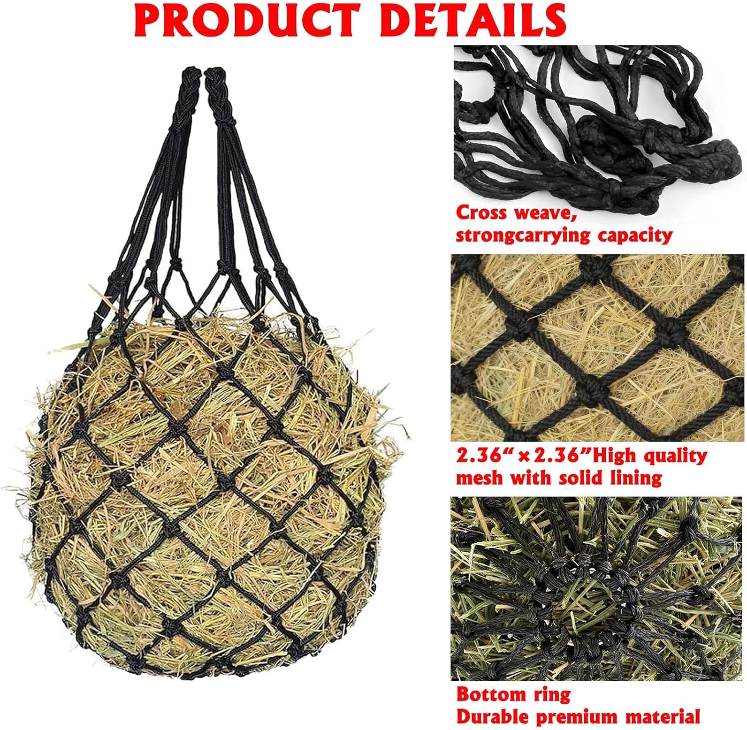 GENEROUS CAPACITY: Each hay net in this 2-pack set holds ample hay for extended feeding times, reducing the frequency of refills needed;The simple and intuitive design of the hay feeder makes it easy to fill, hang, and clean, meeting the needs of different animal owners who seek convenient feeding options