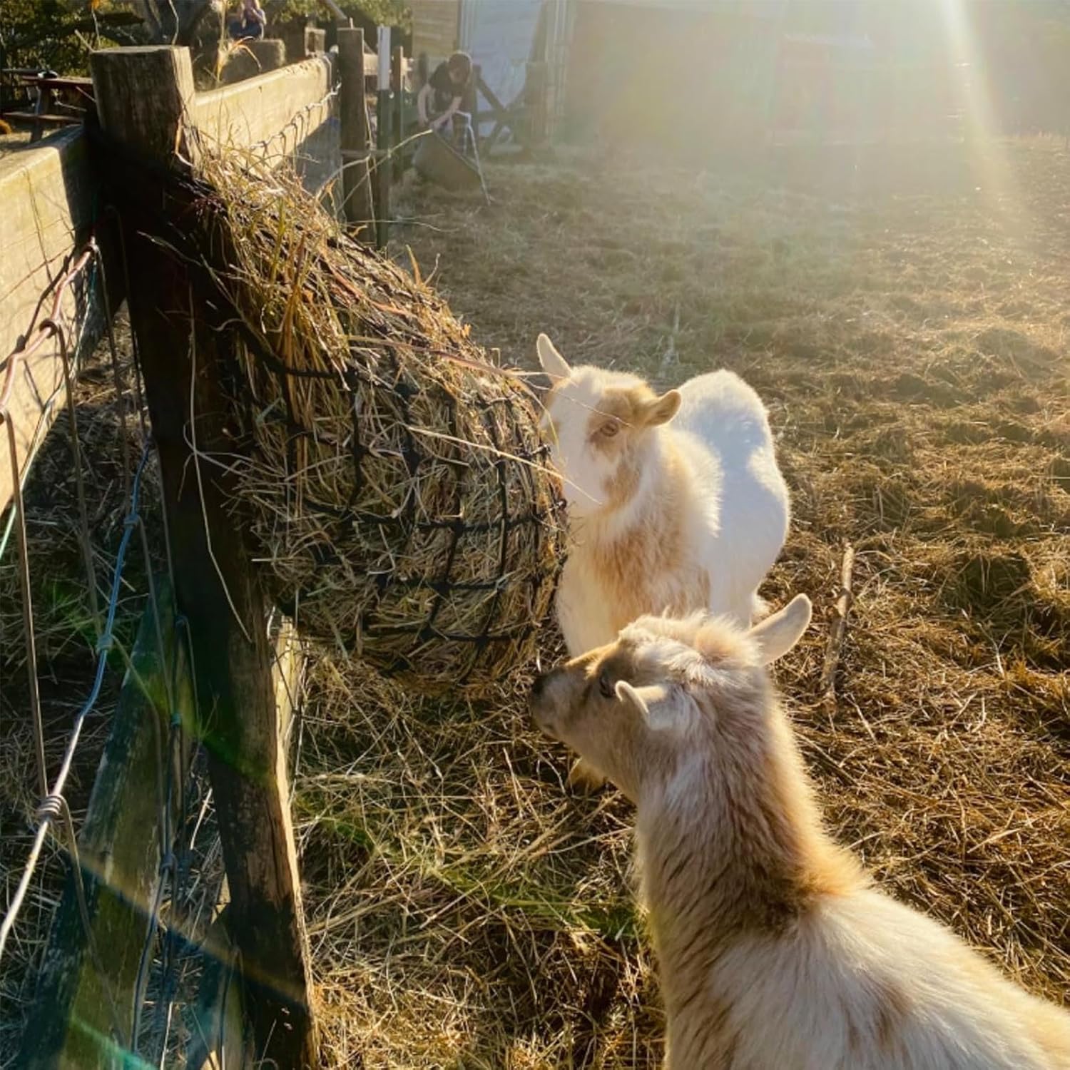 I have tried my different ways of feeding goats hay. Using a slow feed hay net was a last resort because I didn’t think they would work with my goats. The order arrived quickly, and I immediately filled them with grass hay. It was a little difficult because of the length of the grass but to my surprise everything stayed in the net. When they are fully extended with hay, they are light and easy to carry. I got these for two goats that waste more hay than they eat. When I returned the next morning one net was empty and the second half full. There was some hay on the ground but not too much waste. Once hay hits the ground the goats will not eat it. The construction of the nets is sturdy, and I don’t believe the goats can destroy them. I was concerned that the goats horns could get caught in the net. I checked on them while they ate and there wasn’t a problem. Slow feeding is an excellent way to feed livestock. I think these nets will be a good solution for my goats. Good price too.