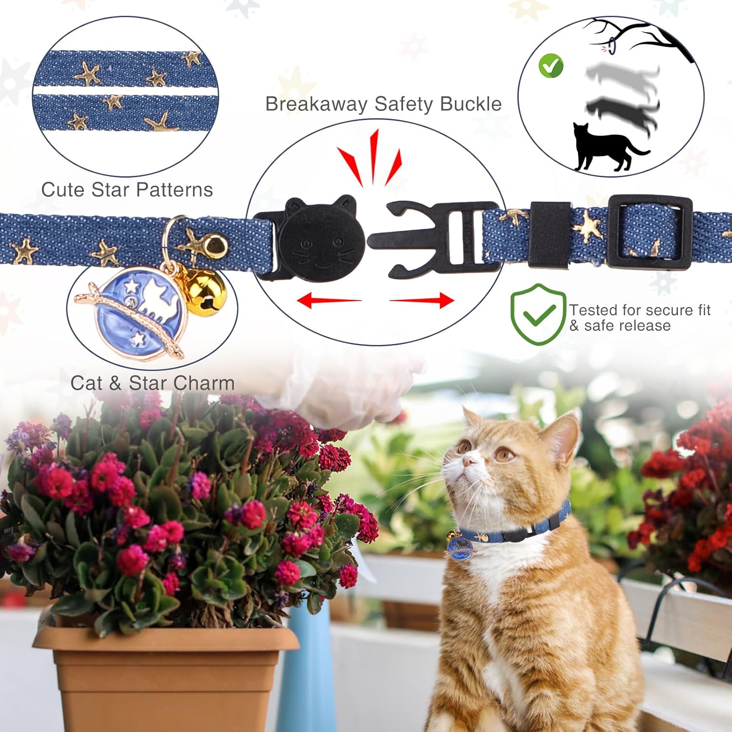 3 Pack Breakaway Cat Collars with Bell- Moon and Stars Pendant Cat Collar for Girl Boy Cats with Safety Buckle- Cute Kitten Collar Adjustable 8″-12″ for Kitty Puppy Small Pets