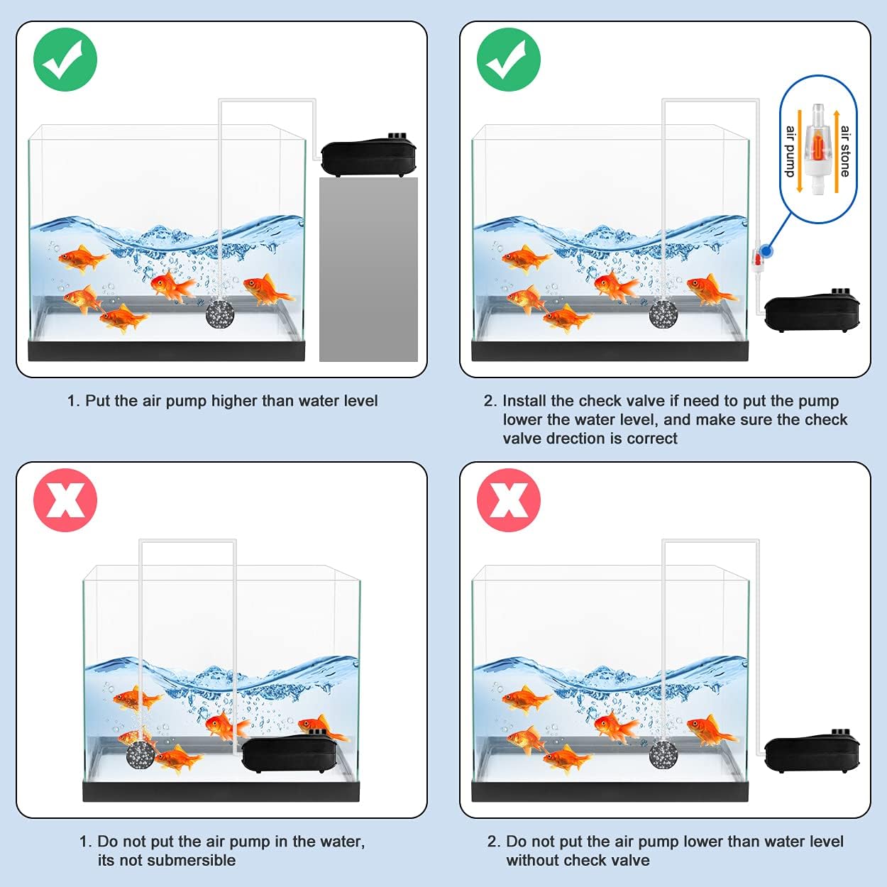 Comes with 4 check valves ,prevent the water backflush the air pump; make sure the check valve direction is correct when install the check valve;